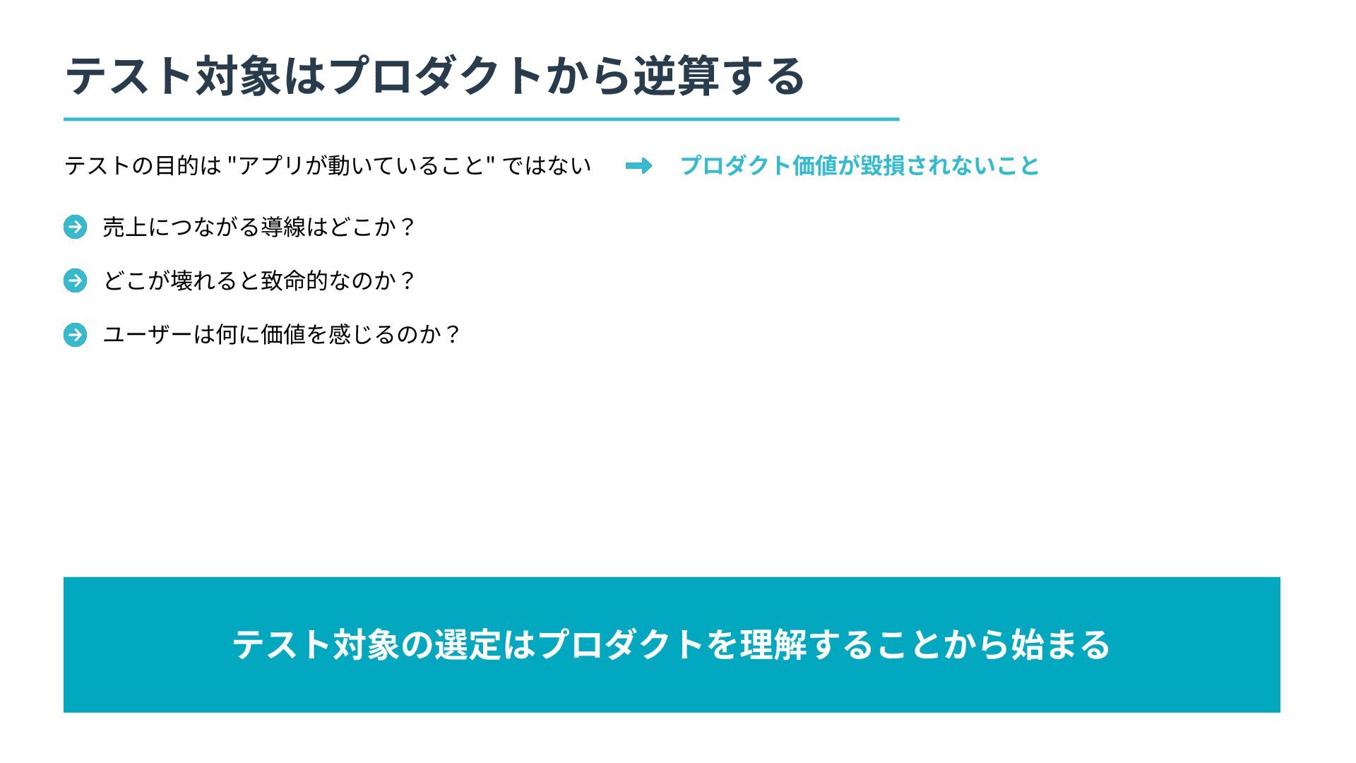 テスト対象はプロダクトから逆算する テスト対象の選定はプロダクトを理解することから始まる テストの⽬的は "アプリが動いていること" ではない プロダクト価値が毀損されないこと 売上につながる導線はどこか? どこが壊れると致命的なのか? ユーザーは何に価値を感じるのか?