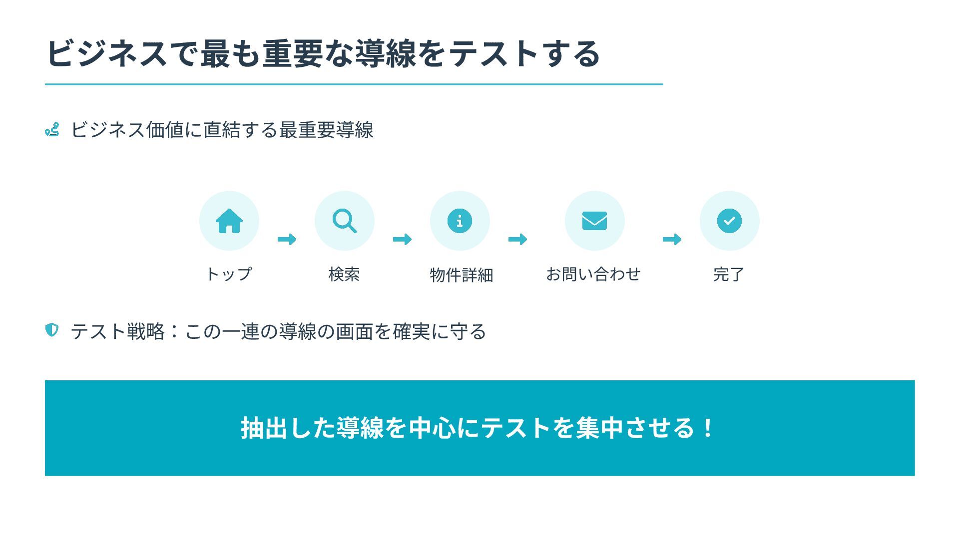 ビジネスで最も重要な導線をテストする ビジネス価値に直結する最重要導線 トップ 検索 物件詳細 お問い合わせ 完了 テスト戦略:この⼀連の導線の画⾯を確実に守る 抽出した導線を中⼼にテストを集中させる!