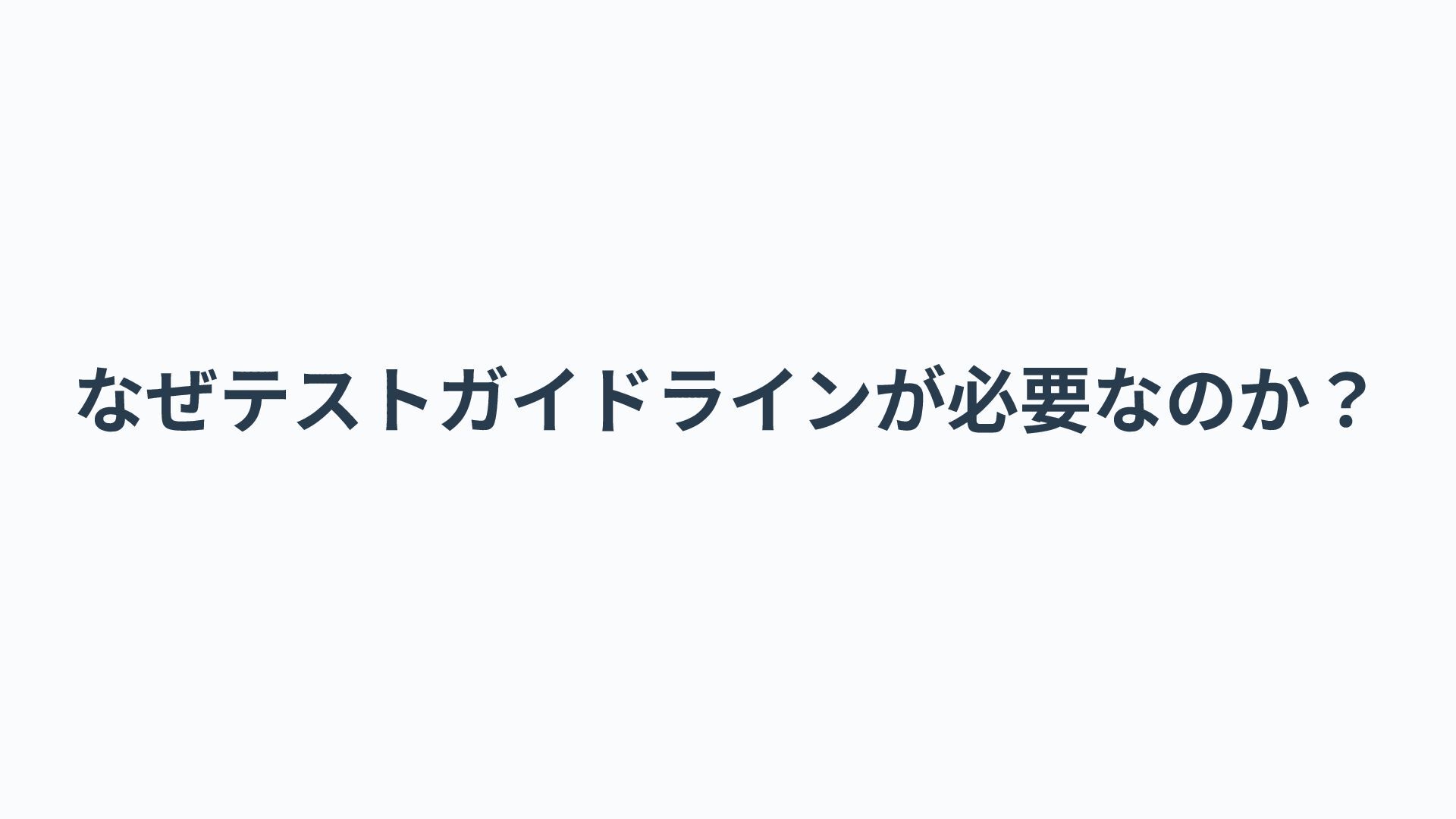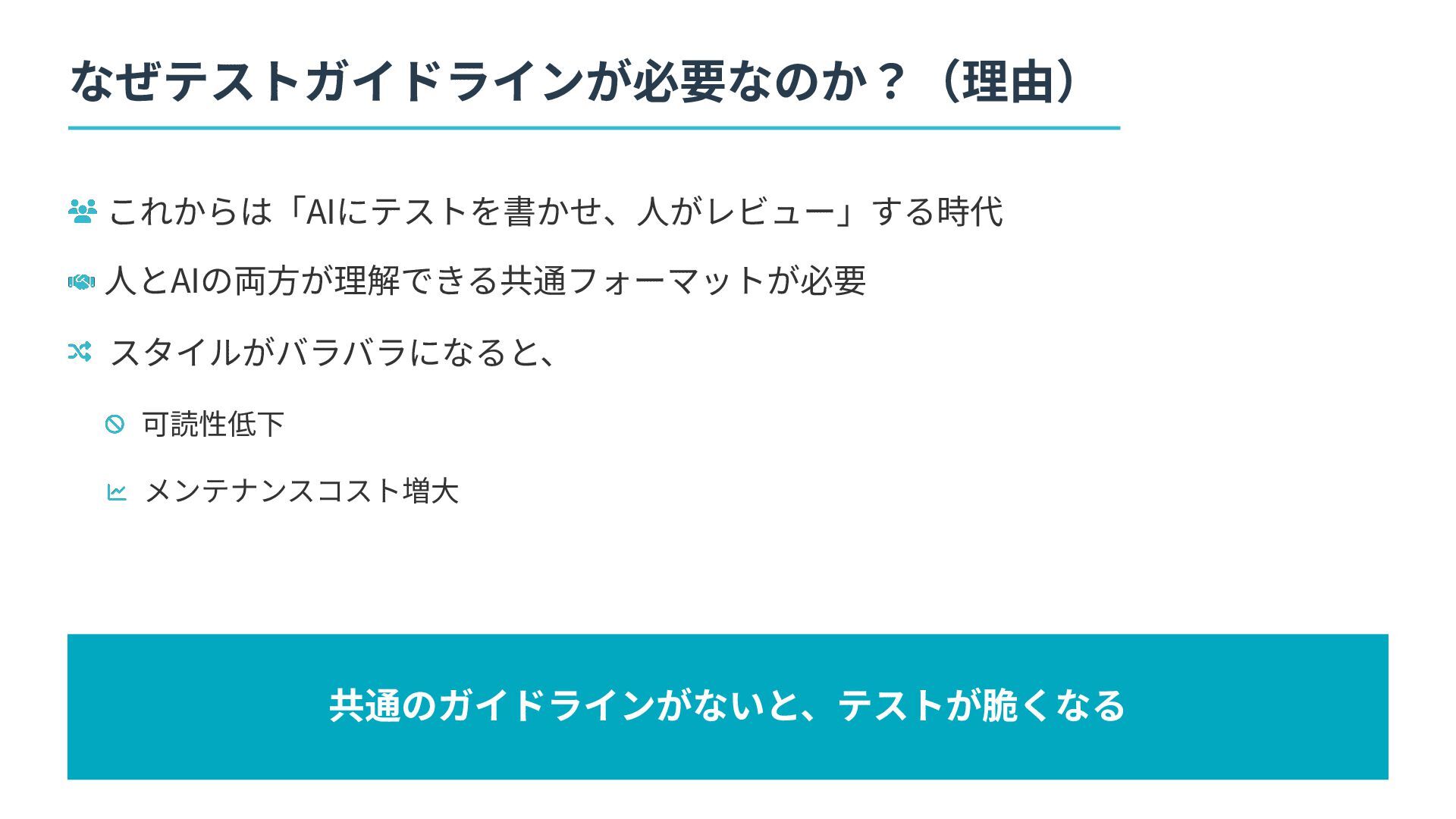 なぜテストガイドラインが必要なのか?(理由) これからは「AIにテストを書かせ、⼈がレビュー」する時代 スタイルがバラバラになると、 可読性低下 メンテナンスコスト増⼤ 共通のガイドラインがないと、テストが脆くなる ⼈とAIの両⽅が理解できる共通フォーマットが必要