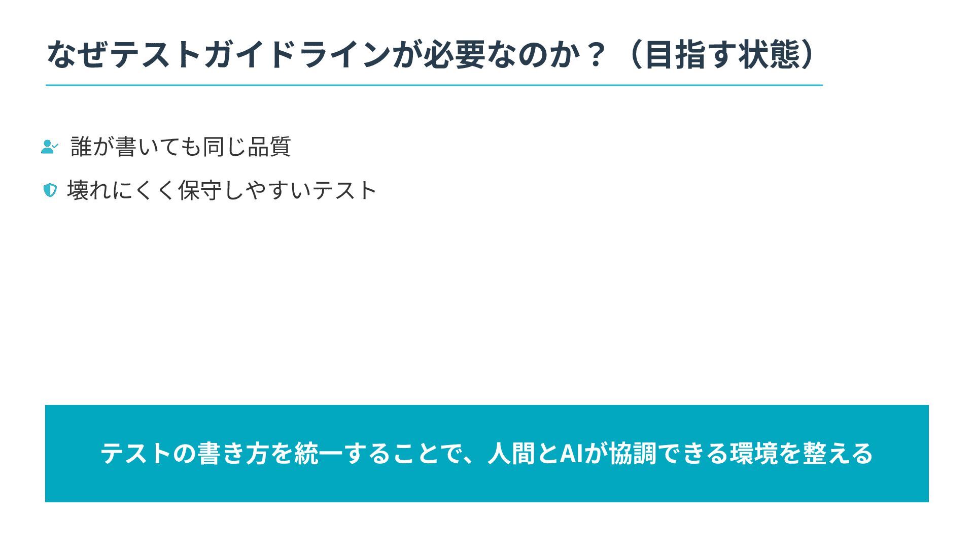 なぜテストガイドラインが必要なのか?(⽬指す状態) 誰が書いても同じ品質 壊れにくく保守しやすいテスト テストの書き⽅を統⼀することで、⼈間とAIが協調できる環境を整える