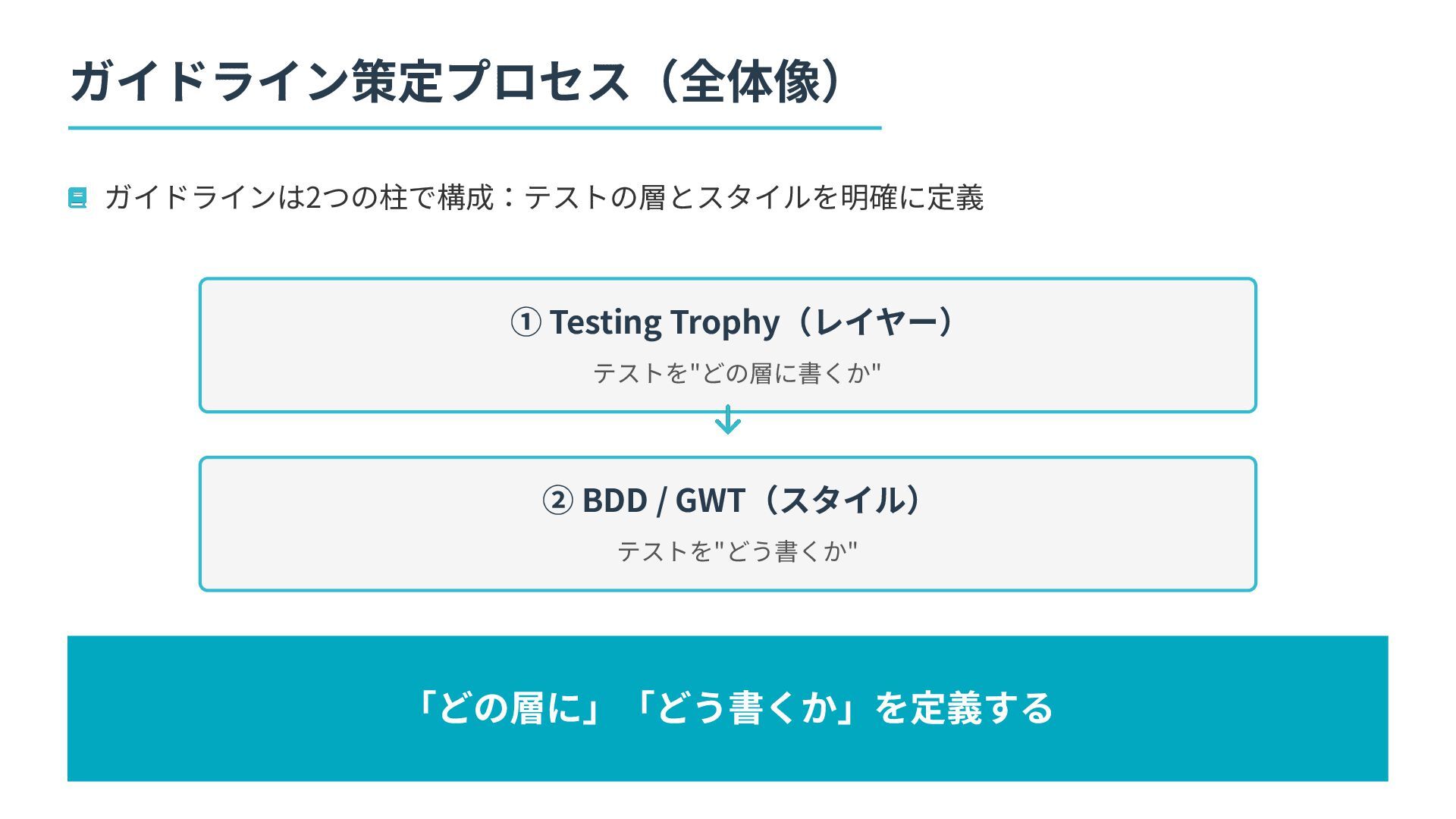 ガイドライン策定プロセス(全体像) ガイドラインは2つの柱で構成:テストの層とスタイルを明確に定義 ① Testing Trophy(レイヤー) テストを"どの層に書くか" ② BDD / GWT(スタイル)