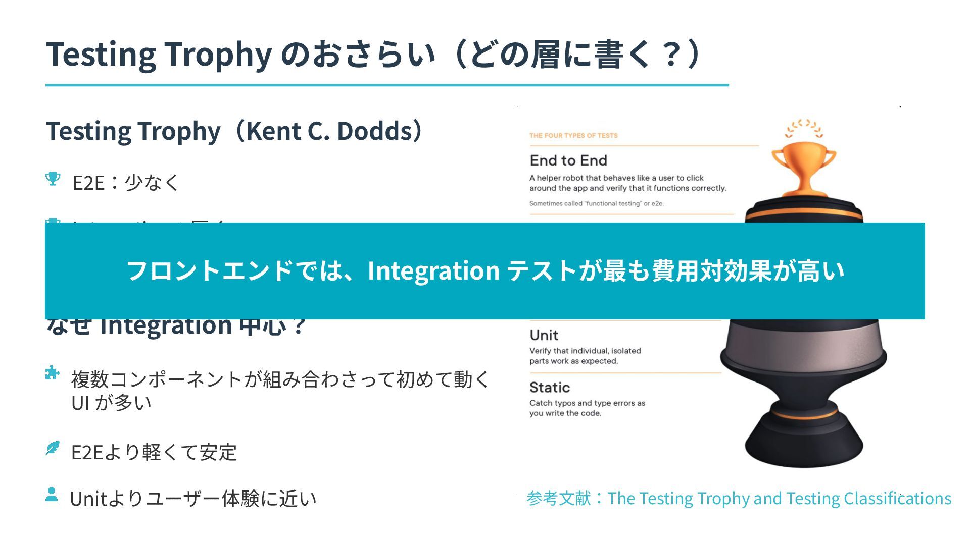 E2E:少なく Integration:厚く Unit:必要なものに最⼩限 複数コンポーネントが組み合わさって初めて動く UI が多い E2Eより軽くて安定 Unitよりユーザー体験に近い 参考⽂献:The Testing Trophy and Testing Classifications フロントエンドでは、Integration テストが最も費⽤対効果が⾼い