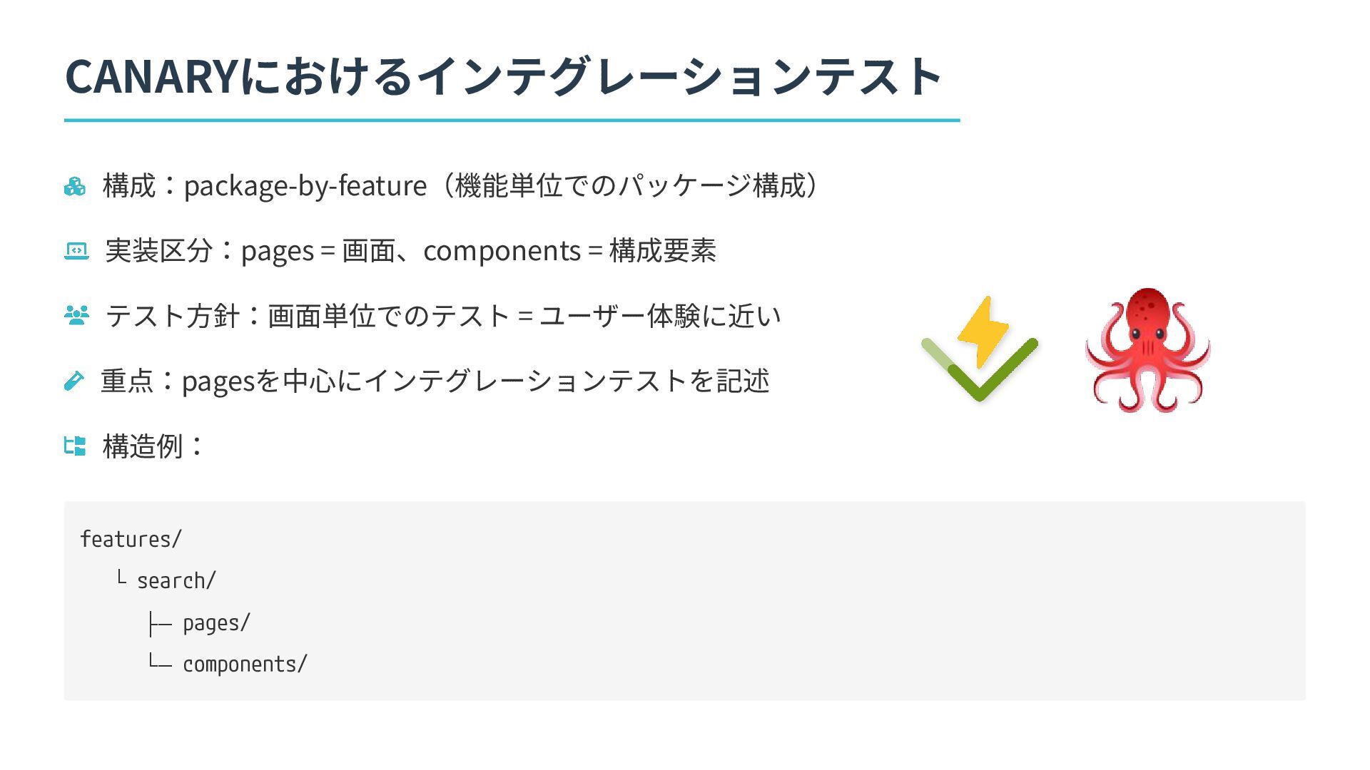 CANARYにおけるインテグレーションテスト 構成:package-by-feature(機能単位でのパッケージ構成) 実装区分:pages = 画⾯、components = 構成要素 テスト⽅針:画⾯単位でのテスト = ユーザー体験に近い