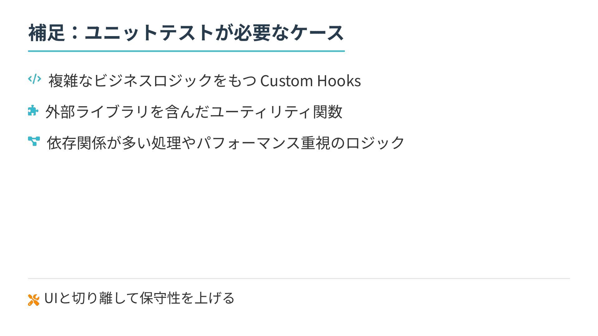 補⾜:ユニットテストが必要なケース 複雑なビジネスロジックをもつ Custom Hooks 外部ライブラリを含んだユーティリティ関数 依存関係が多い処理やパフォーマンス重視のロジック UIと切り離して保守性を上げる