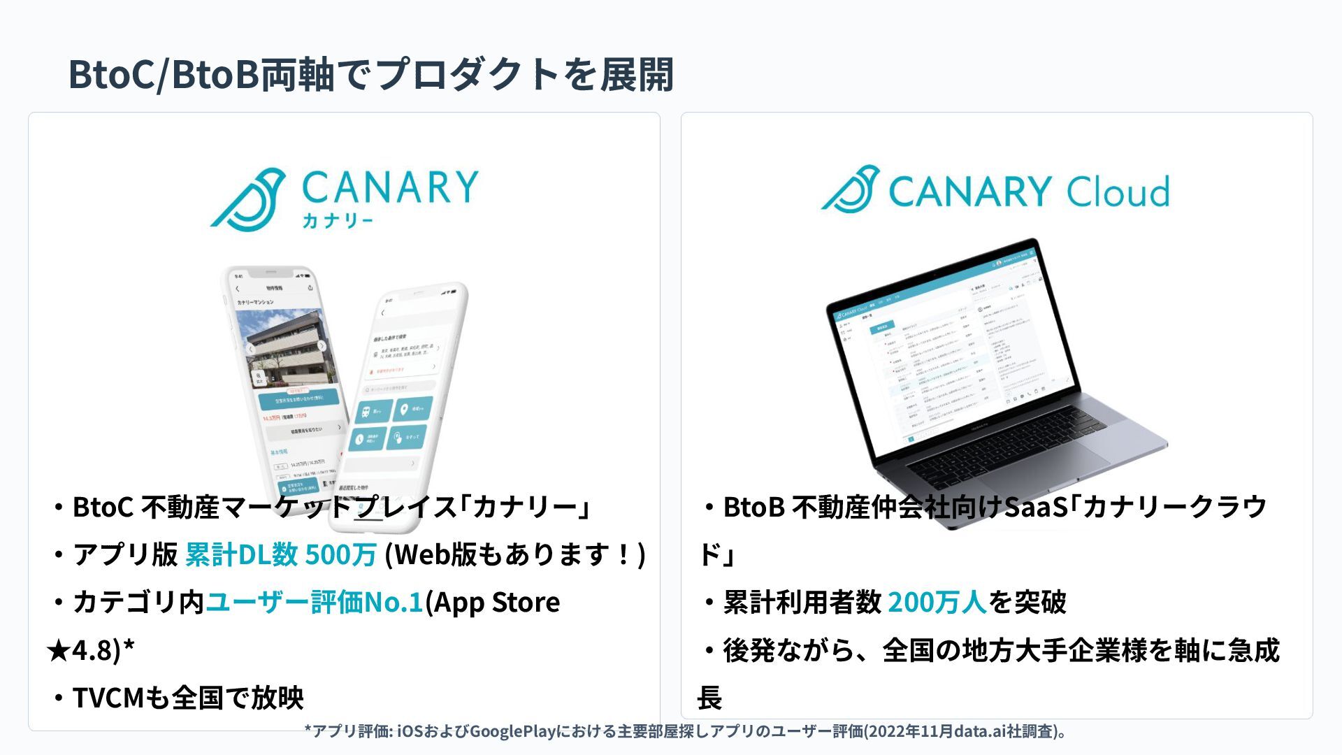 BtoC/BtoB両軸でプロダクトを展開 *アプリ評価: iOSおよびGooglePlayにおける主要部屋探しアプリのユーザー評価(2022年11⽉data.ai社調査)。 ‧BtoC 不動産マーケットプレイス「カナリー」 ‧アプリ版 累計DL数 500万 (Web版もあります!) ‧カテゴリ内ユーザー評価No.1(App