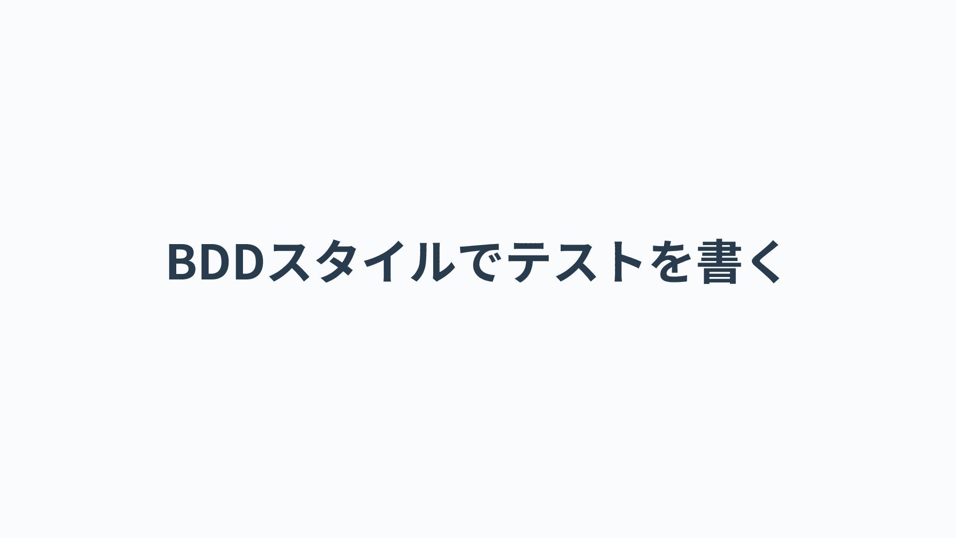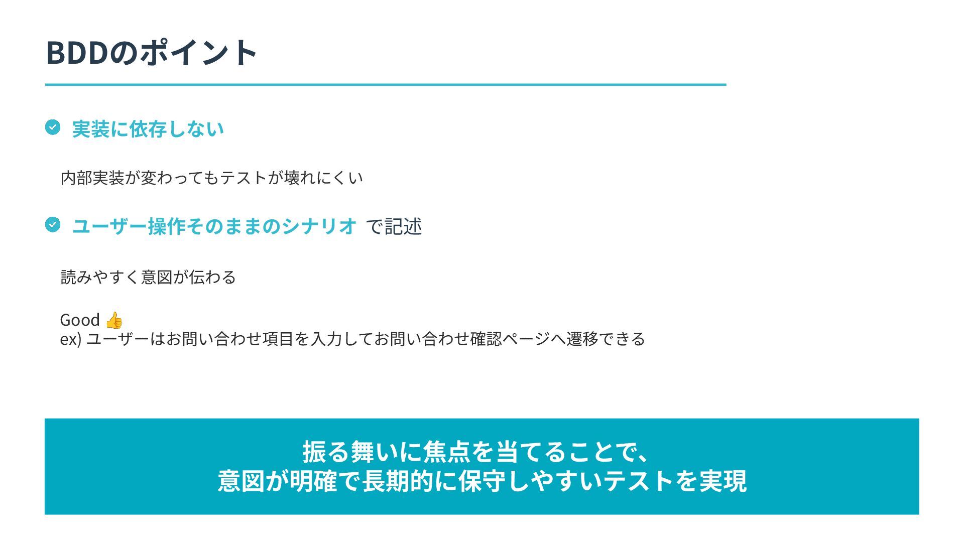 BDDのポイント 実装に依存しない 内部実装が変わってもテストが壊れにくい ユーザー操作そのままのシナリオ 読みやすく意図が伝わる で記述 振る舞いに焦点を当てることで、 意図が明確で⻑期的に保守しやすいテストを実現 Good 👍
