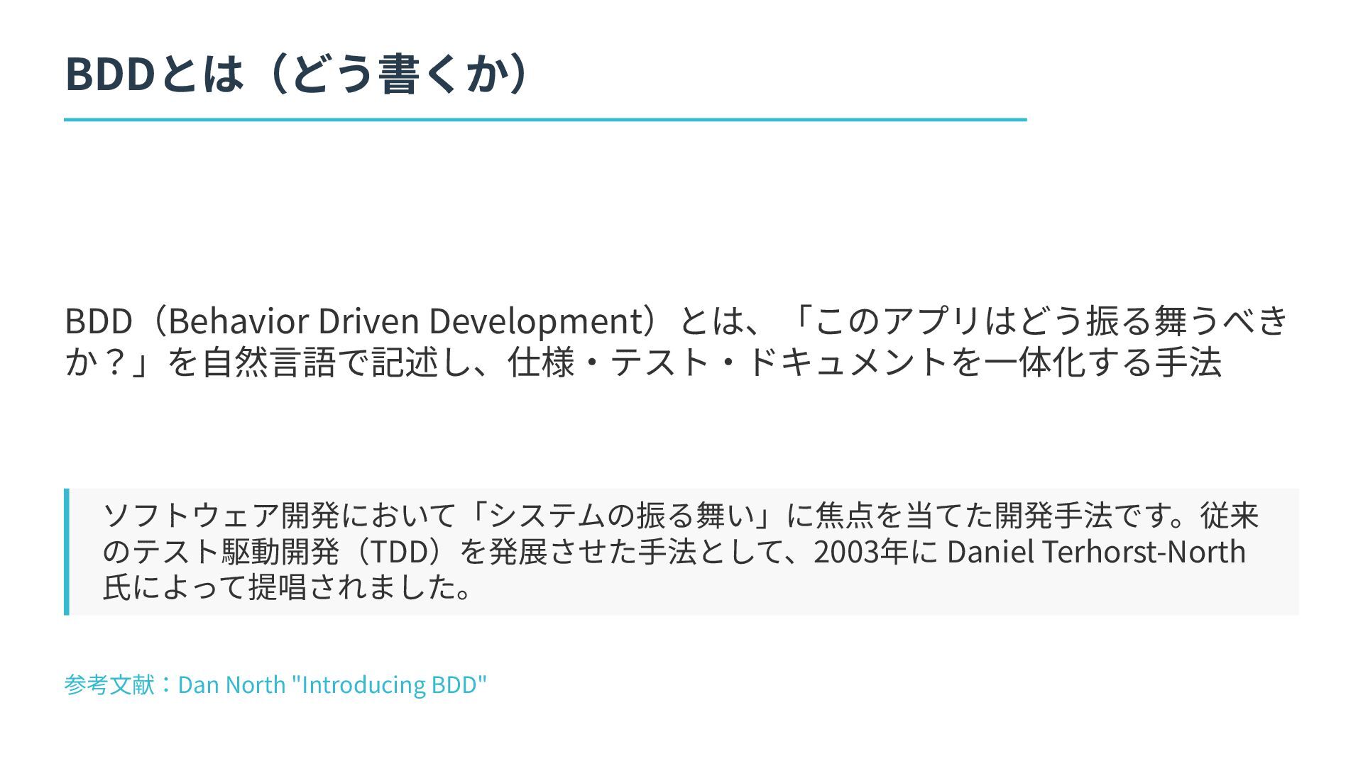 BDDとは(どう書くか) BDD(Behavior Driven Development)とは、「このアプリはどう振る舞うべき か?」を⾃然⾔語で記述し、仕様‧テスト‧ドキュメントを⼀体化する⼿法 ソフトウェア開発において「システムの振る舞い」に焦点を当てた開発⼿法です。従来 のテスト駆動開発(TDD)を発展させた⼿法として、2003年に Daniel Terhorst-North ⽒によって提唱されました。