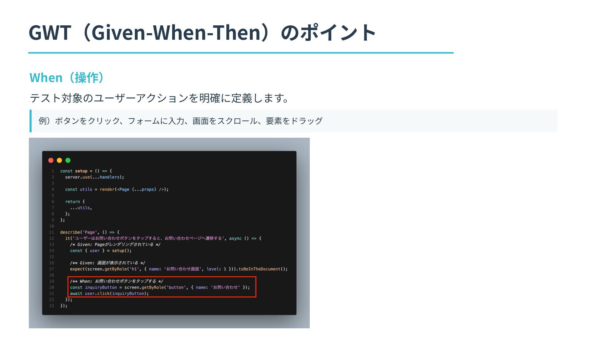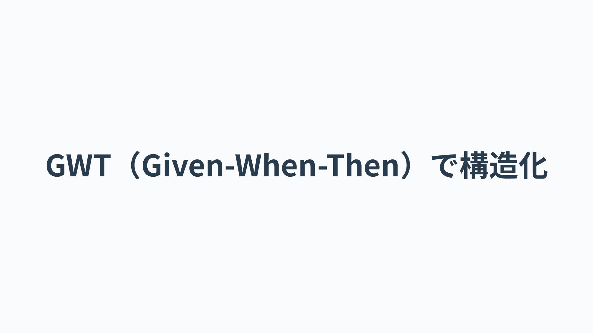 GWT(Given-When-Then)のポイント When(操作) テスト対象のユーザーアクションを明確に定義します。 例)ボタンをクリック、フォームに⼊⼒、画⾯をスクロール、要素をドラッグ