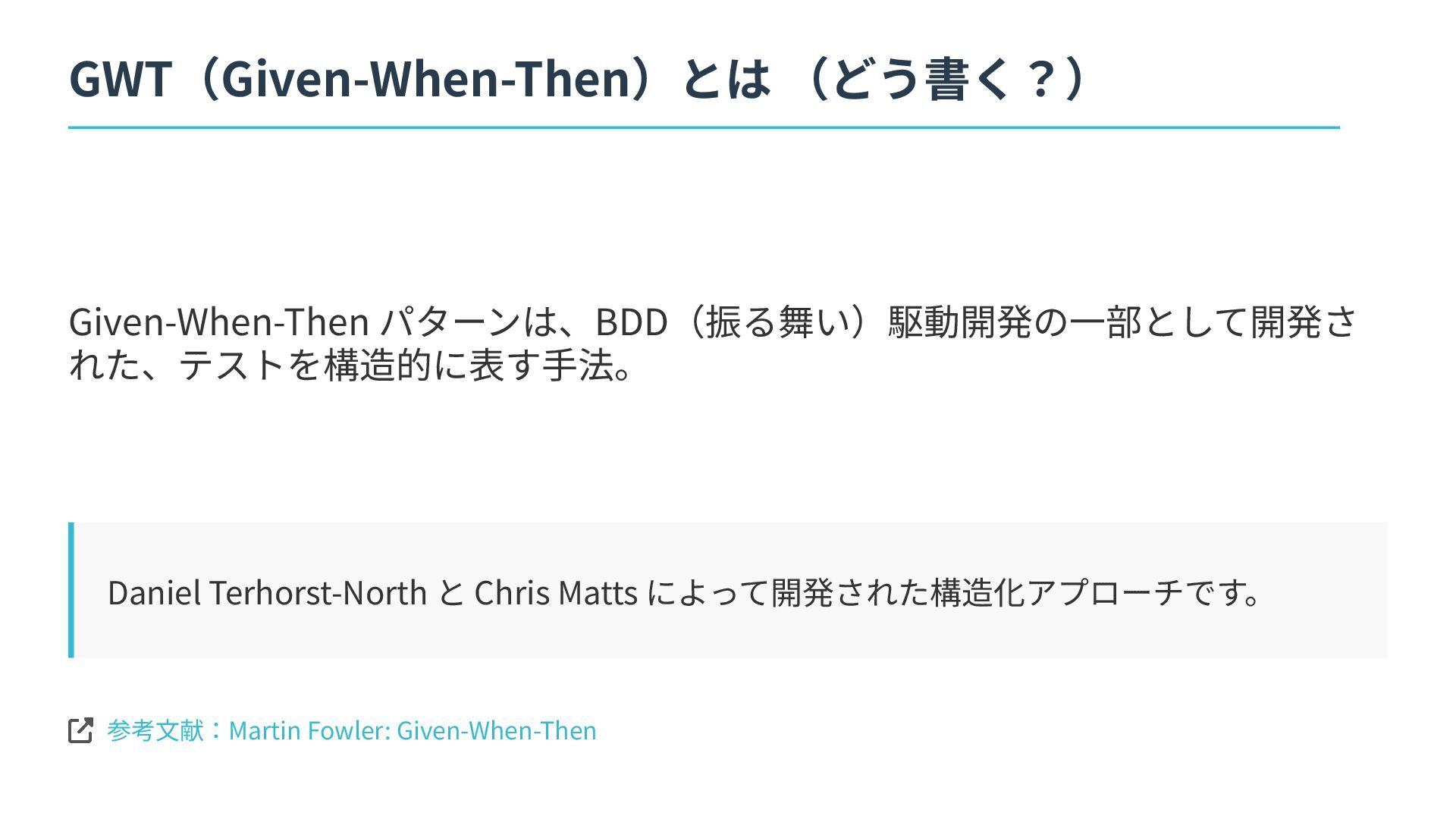 によって開発された構造化アプローチです。 参考⽂献:Martin Fowler: Given-When-Then
