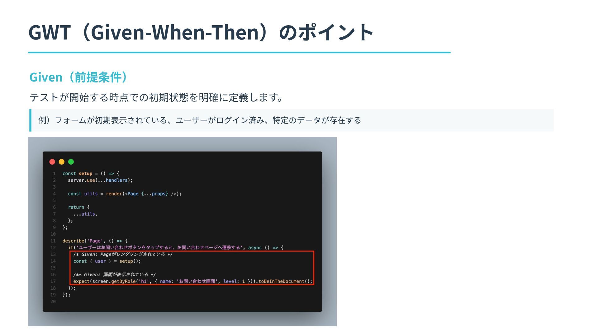 GWT(Given-When-Then)のポイント Given(前提条件) テストが開始する時点での初期状態を明確に定義します。 例)フォームが初期表⽰されている、ユーザーがログイン済み、特定のデータが存在する