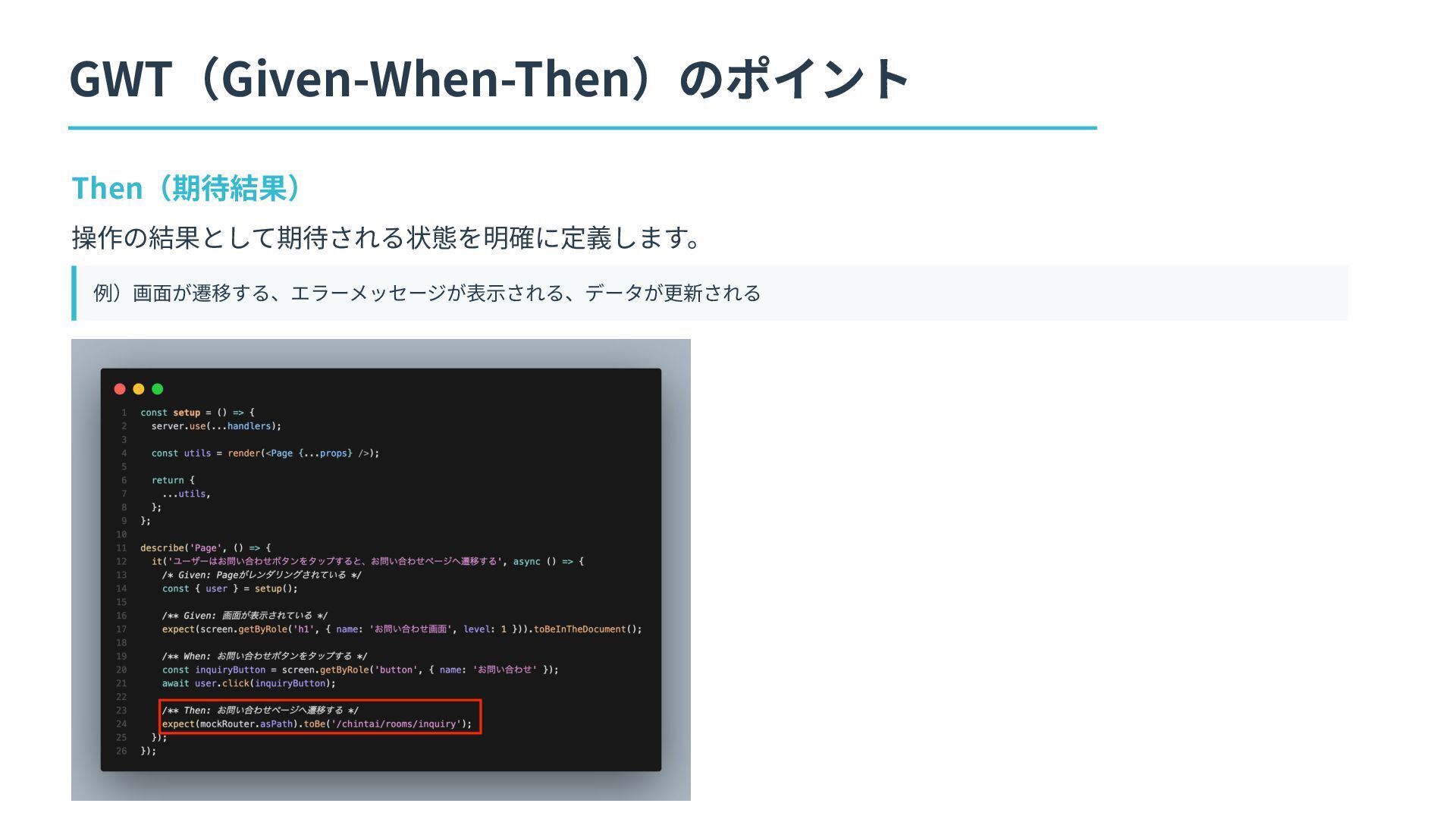 GWT(Given-When-Then)のポイント Then(期待結果) 操作の結果として期待される状態を明確に定義します。 例)画⾯が遷移する、エラーメッセージが表⽰される、データが更新される