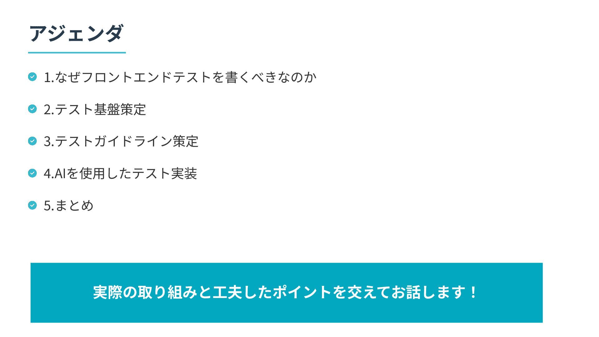 アジェンダ 1.なぜフロントエンドテストを書くべきなのか 2.テスト基盤策定 3.テストガイドライン策定 4.AIを使⽤したテスト実装 5.まとめ 実際の取り組みと⼯夫したポイントを交えてお話します!