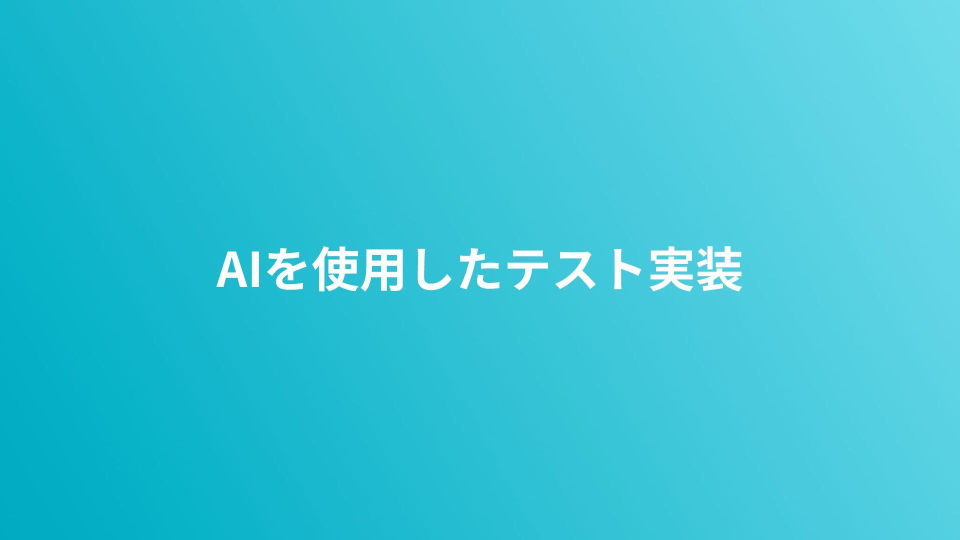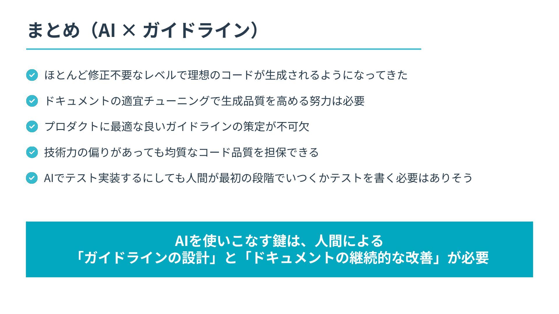 まとめ(AI × ガイドライン) ほとんど修正不要なレベルで理想のコードが⽣成されるようになってきた ドキュメントの適宜チューニングで⽣成品質を⾼める努⼒は必要 プロダクトに最適な良いガイドラインの策定が不可⽋ 技術⼒の偏りがあっても均質なコード品質を担保できる AIを使いこなす鍵は、⼈間による 「ガイドラインの設計」と「ドキュメントの継続的な改善」が必要 AIでテスト実装するにしても⼈間が最初の段階でいつくかテストを書く必要はありそう