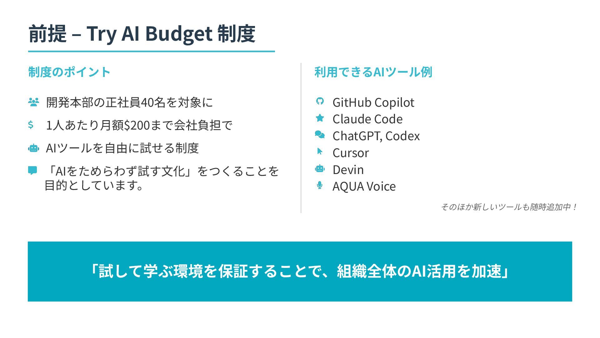 前提 ‒ Try AI Budget 制度 制度のポイント 開発本部の正社員40名を対象に 1⼈あたり⽉額$200まで会社負担で AIツールを⾃由に試せる制度