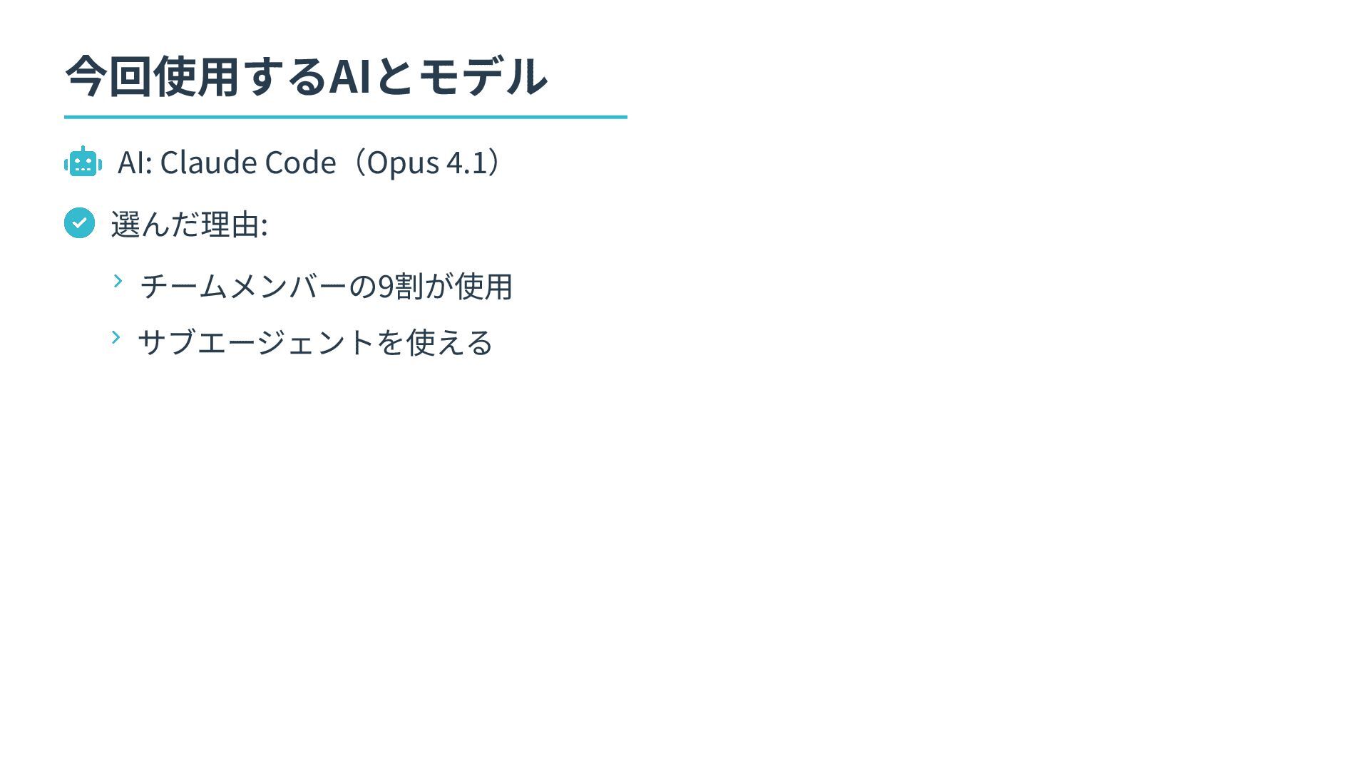 今回使⽤するAIとモデル AI: Claude Code(Opus 4.1) 選んだ理由: チームメンバーの9割が使⽤ サブエージェントを使える