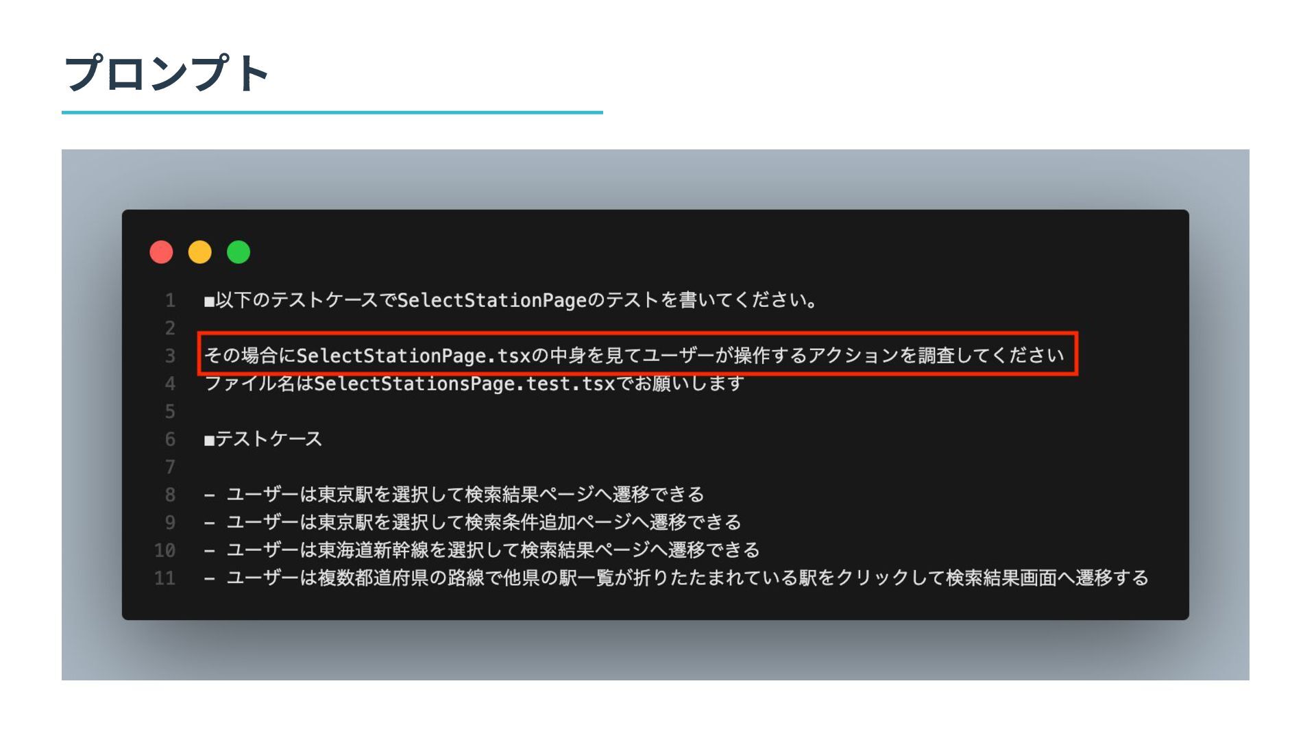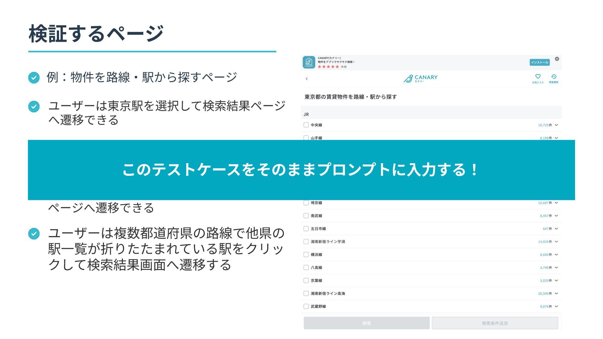クして検索結果画⾯へ遷移する このテストケースをそのままプロンプトに⼊⼒する!