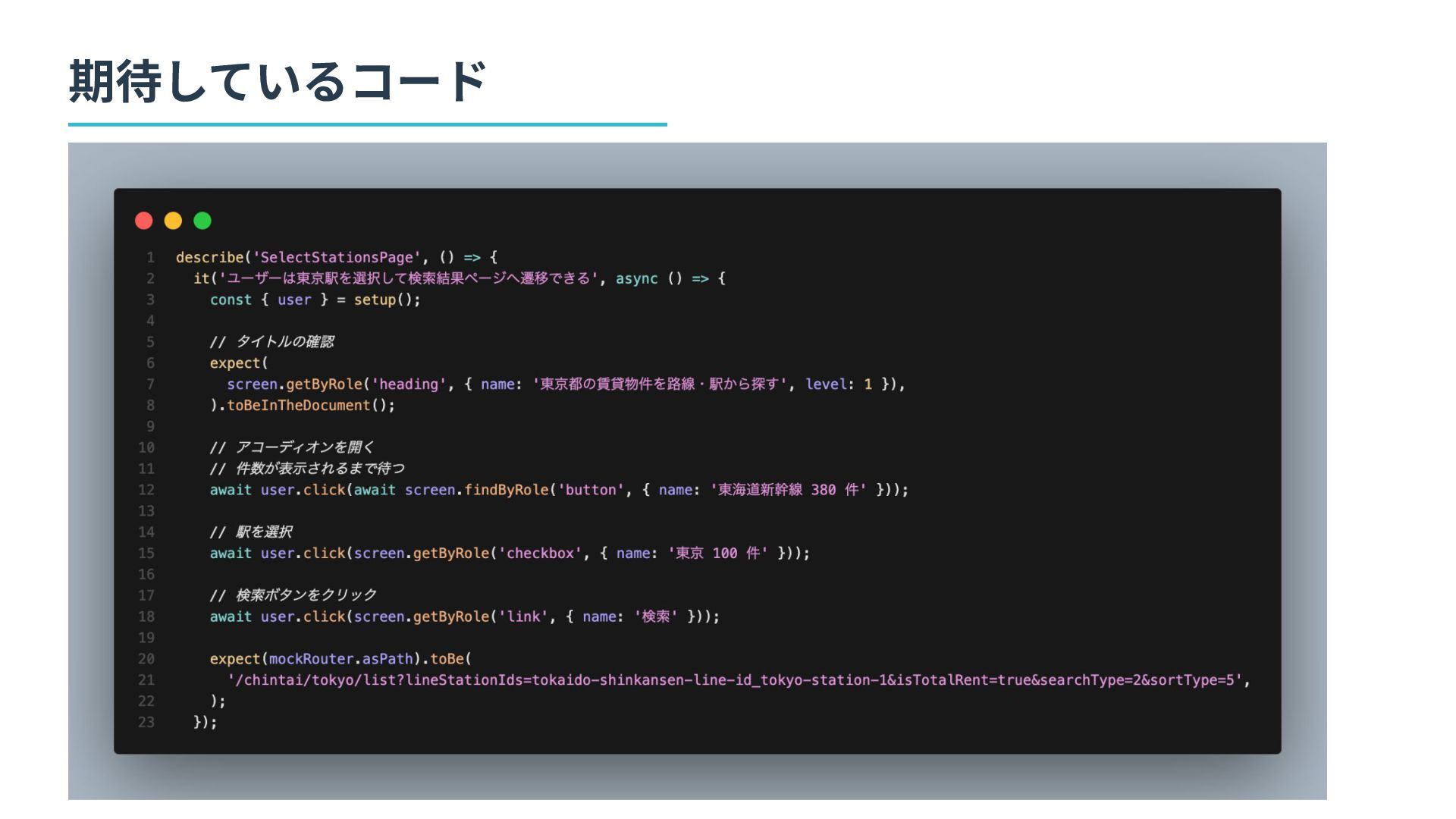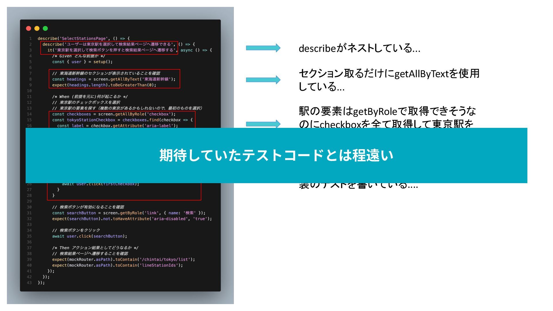describeがネストしている... セクション取るだけにgetAllByTextを使用 している... 駅の要素はgetByRoleで取得できそうな のにcheckboxを全て取得して東京駅を 検索している.... チェックボックスがあるかないかなど実 装のテストを書いている.... 期待していたテストコードとは程遠い