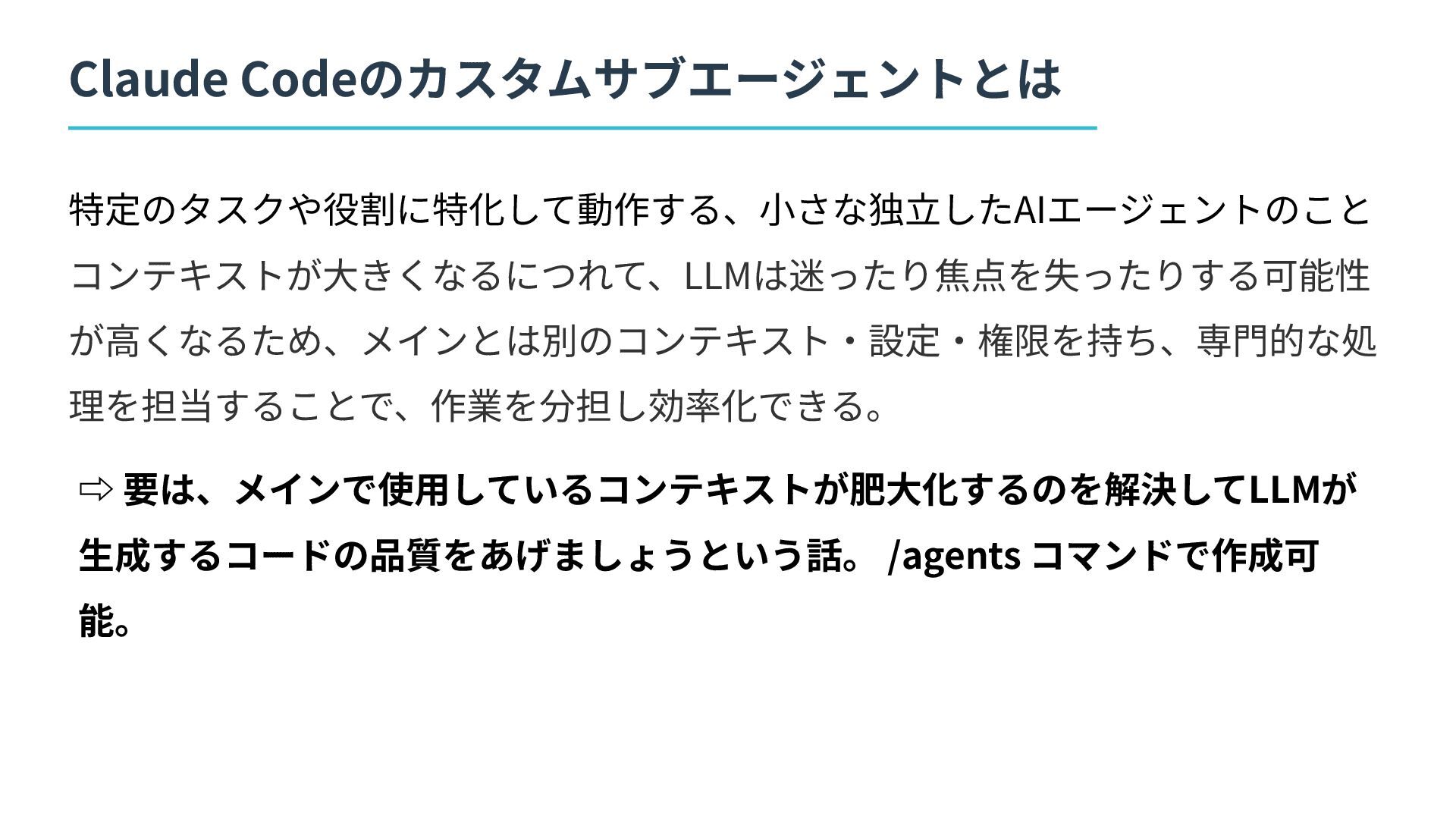 Claude Codeのカスタムサブエージェントとは 特定のタスクや役割に特化して動作する、⼩さな独⽴したAIエージェントのこと コンテキストが⼤きくなるにつれて、LLMは迷ったり焦点を失ったりする可能性 が⾼くなるため、メインとは別のコンテキスト‧設定‧権限を持ち、専⾨的な処 理を担当することで、作業を分担し効率化できる。 ⇨ 要は、メインで使⽤しているコンテキストが肥⼤化するのを解決してLLMが ⽣成するコードの品質をあげましょうという話。 /agents