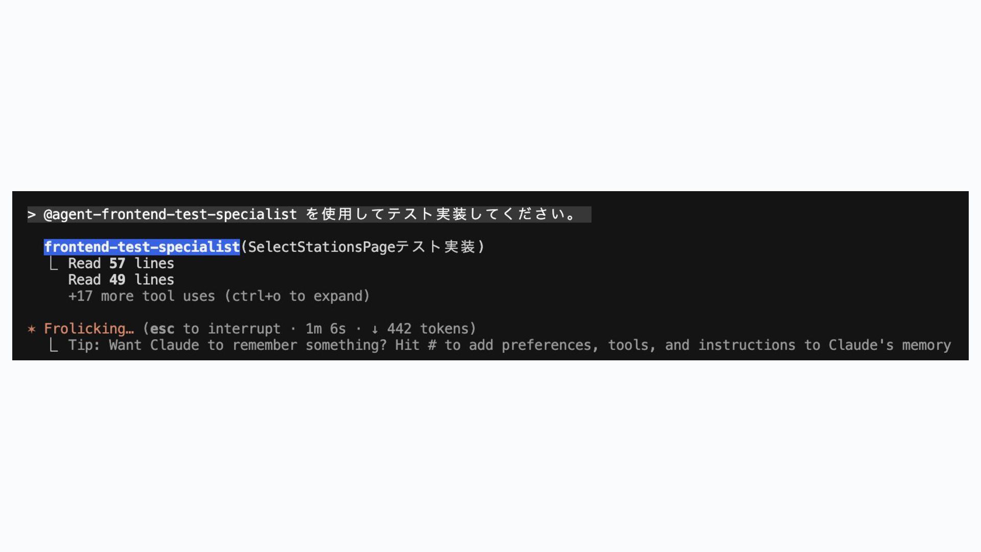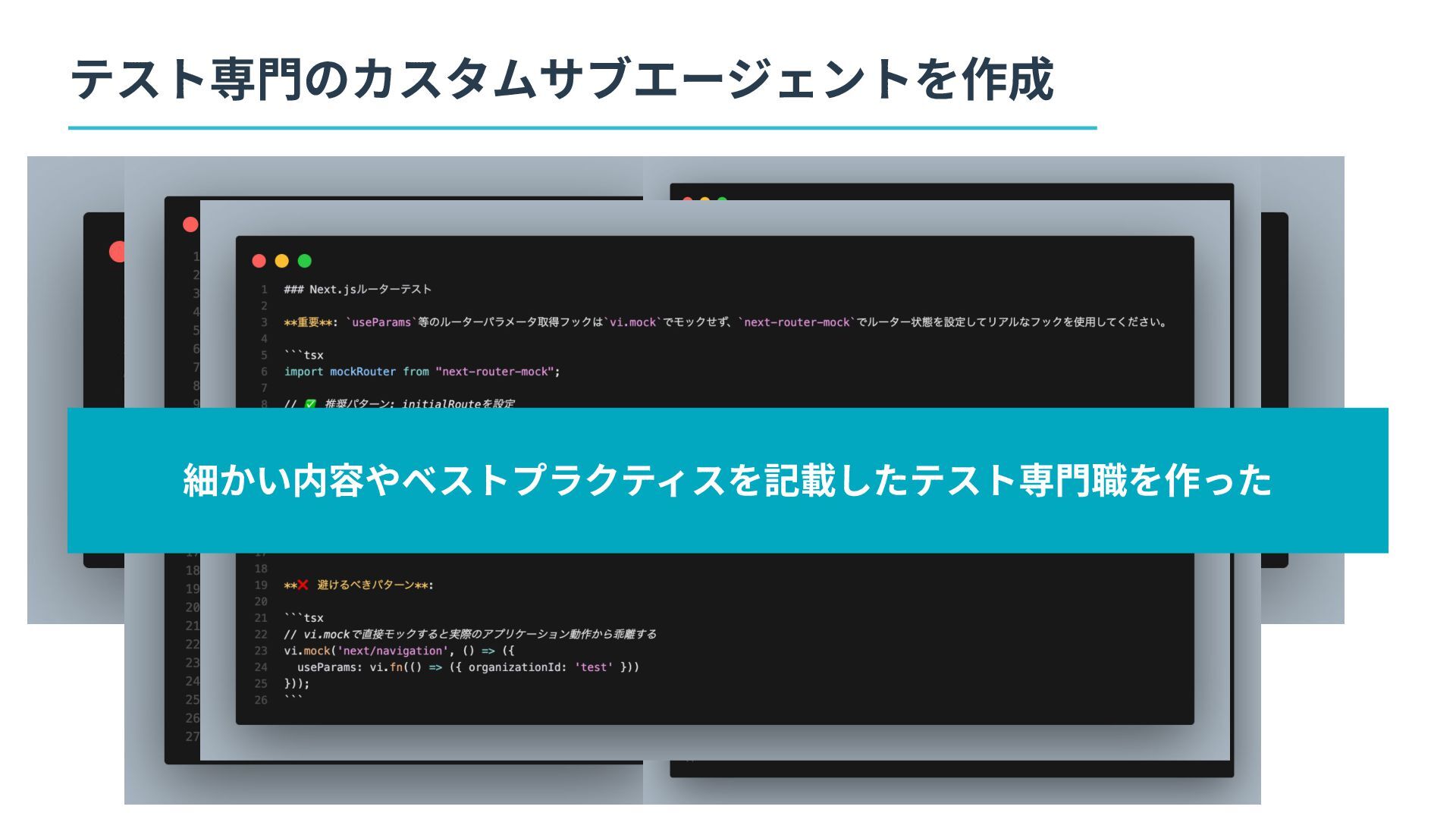 テスト専⾨のカスタムサブエージェントを作成 細かい内容やベストプラクティスを記載したテスト専⾨職を作った