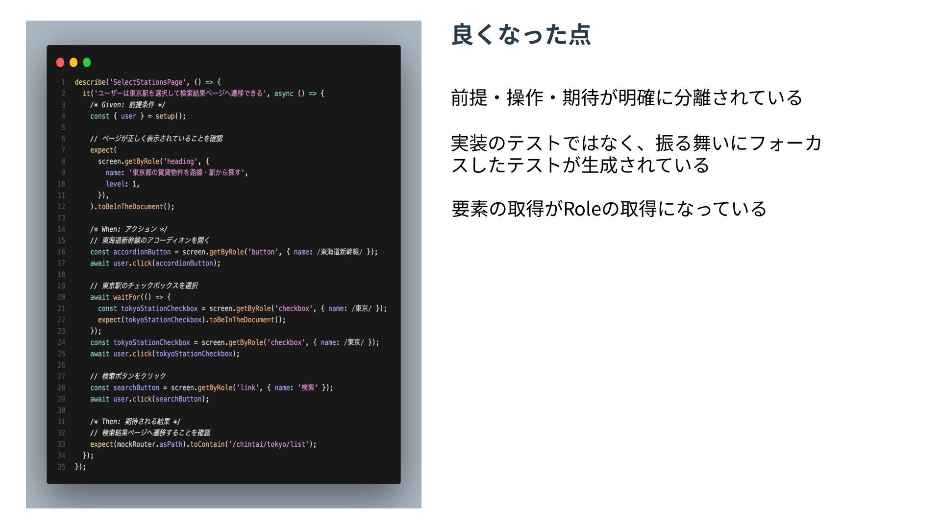 良くなった点 前提‧操作‧期待が明確に分離されている 実装のテストではなく、振る舞いにフォーカ スしたテストが⽣成されている 要素の取得がRoleの取得になっている