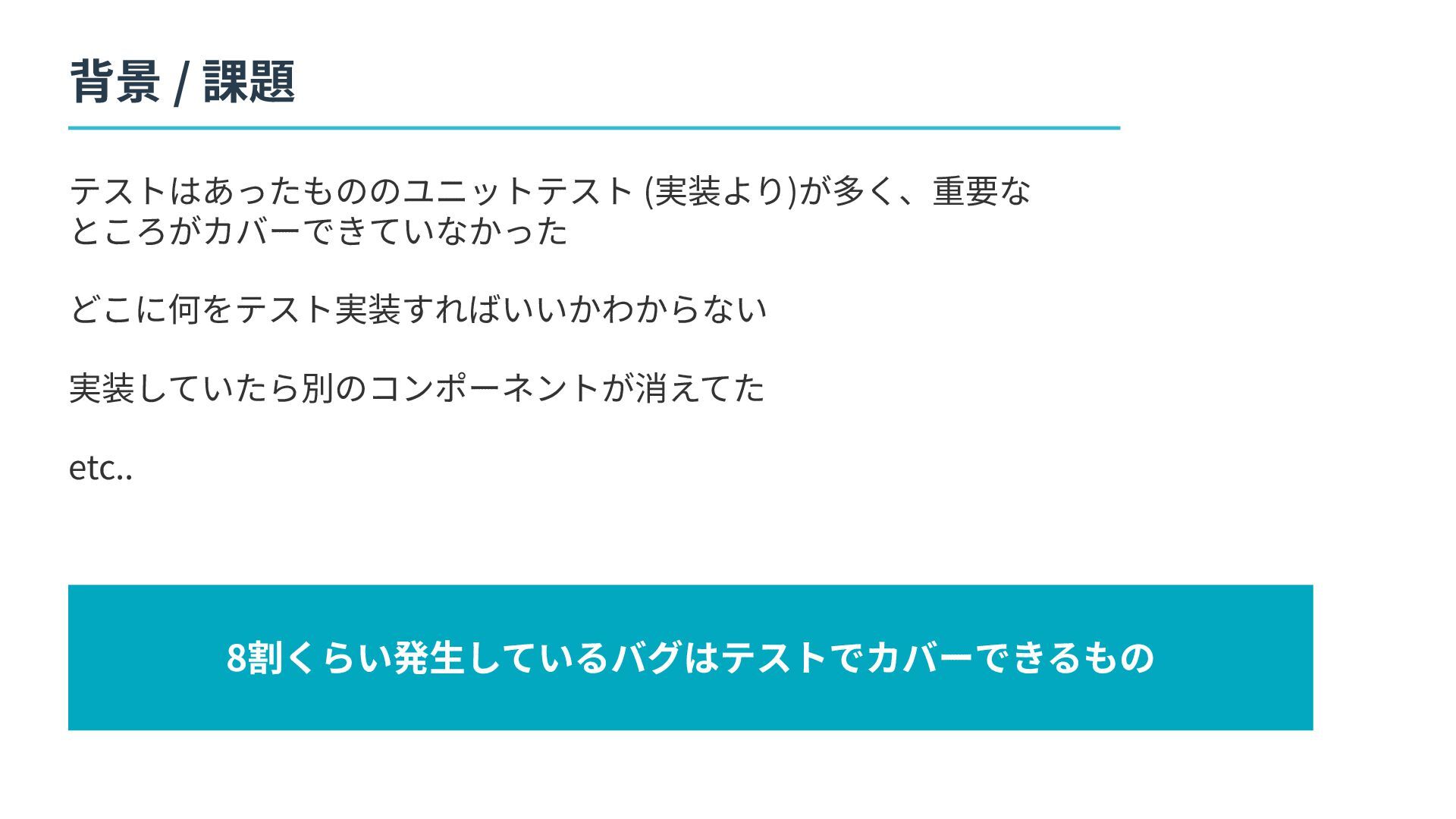 背景 / 課題 テストはあったもののユニットテスト (実装より)が多く、重要な ところがカバーできていなかった どこに何をテスト実装すればいいかわからない 実装していたら別のコンポーネントが消えてた 8割くらい発⽣しているバグはテストでカバーできるもの etc..