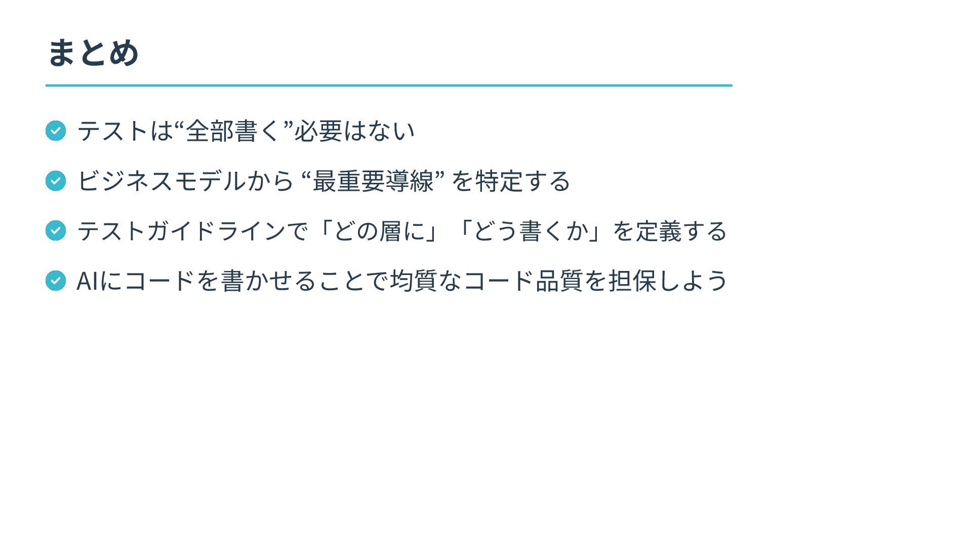 まとめ テストは“全部書く”必要はない ビジネスモデルから “最重要導線” を特定する テストガイドラインで「どの層に」「どう書くか」を定義する AIにコードを書かせることで均質なコード品質を担保しよう