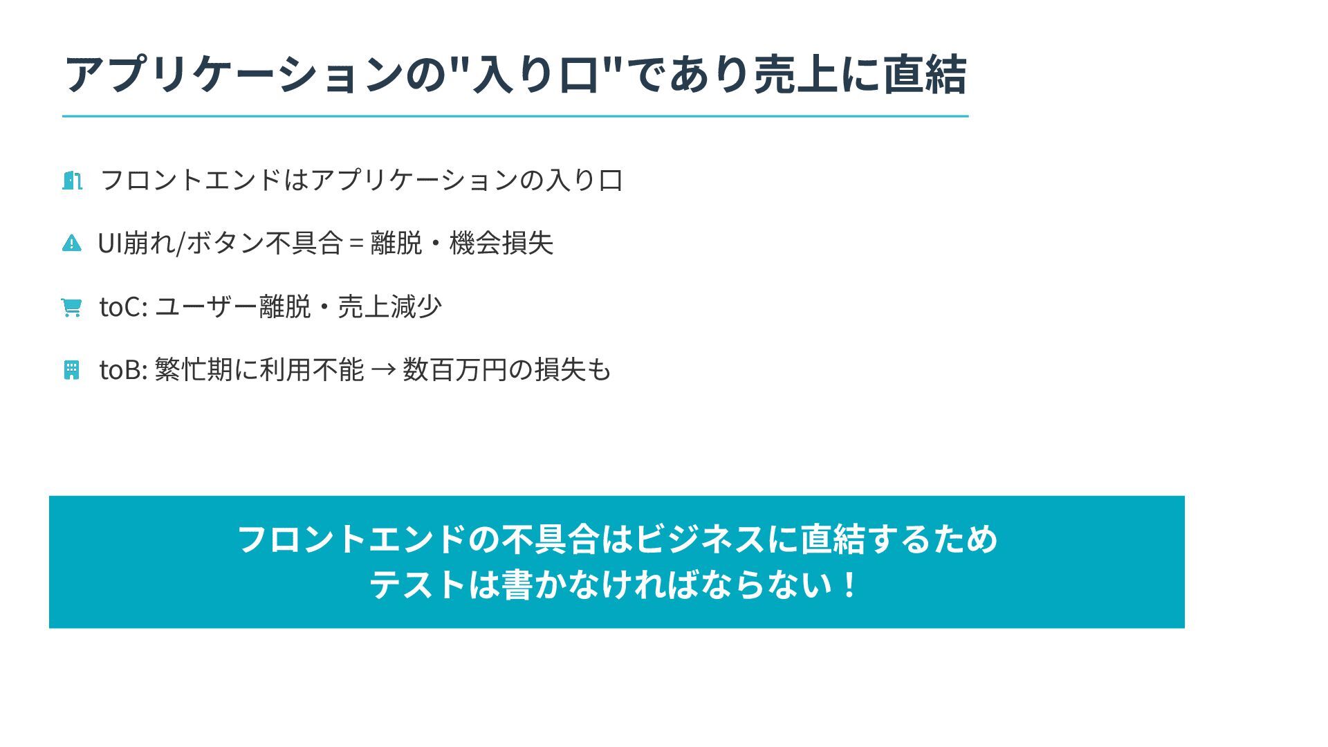 数百万円の損失も フロントエンドの不具合はビジネスに直結するため テストは書かなければならない!
