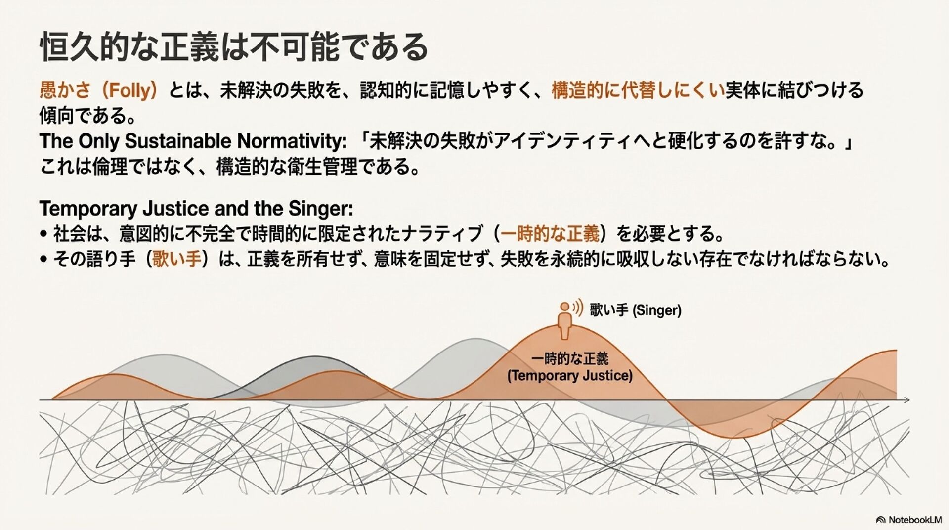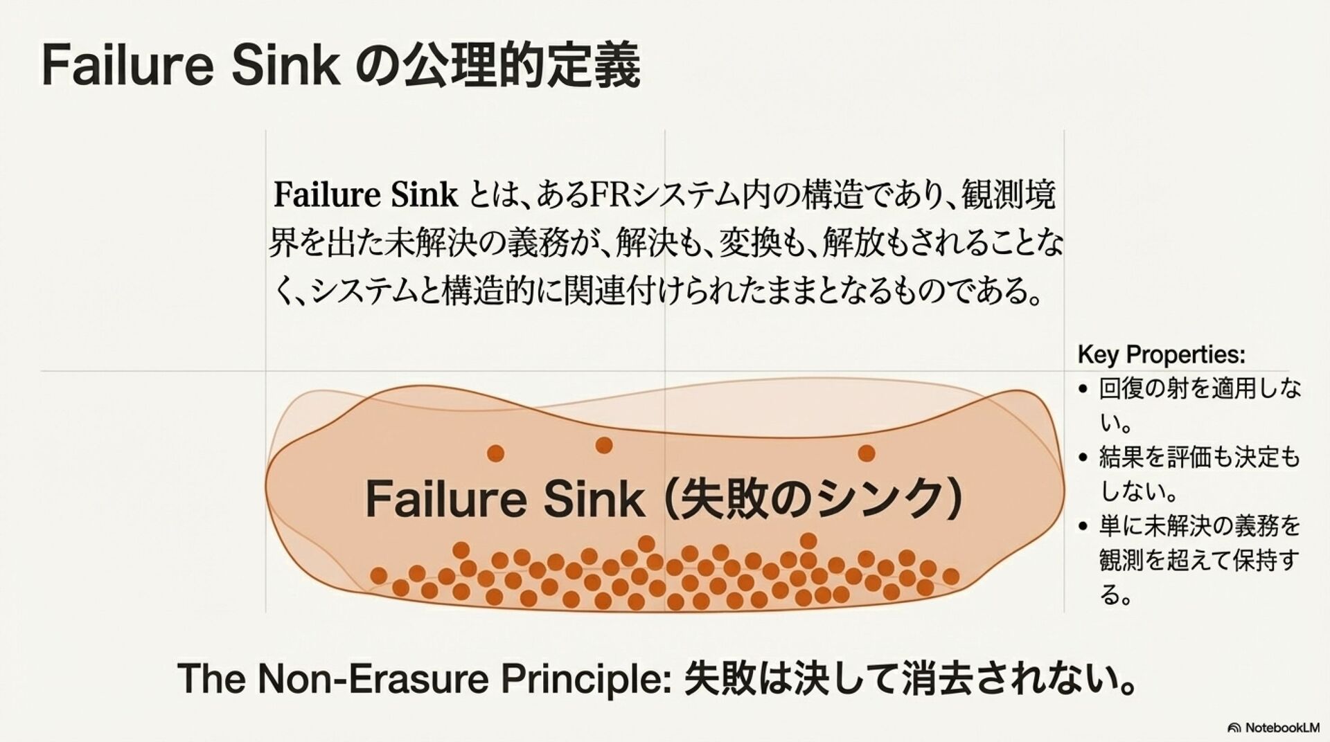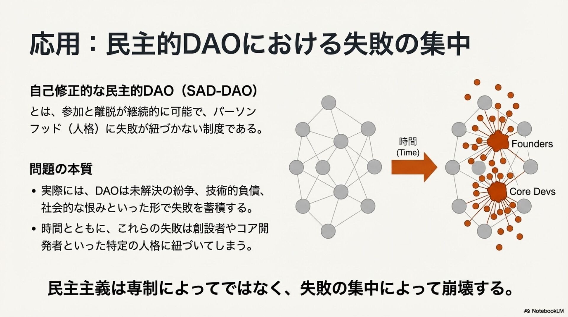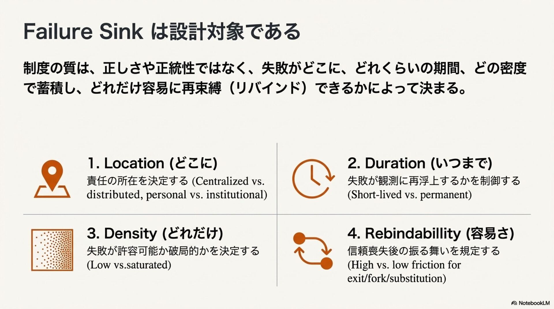 公理的集合論に基づいた構成的な手法でFailure-Recovery Monadsを定義した。これはSystem of Systemsの壊れやすさを緩和するための工学的技法であると同時に、人文的な複雑系を数理論理的に記述する有用な道具立てである。このFRMonadの上にFailure Sink概念を定義し、Failure Sinkを公理として大衆を含む論理における失敗可能性と失敗の損失のしわ寄せ先に関する定式化を行った。この分析フレームワークを用いることで、独裁制・間接民主制・直接民主制・P2Pプロトコルなどの多様な複雑系の挙動を数理論理的に記述することが可能となった。本スライドはFailure Sinkのレンズを通して見た社会における正義論のあり方について議論し、数理論理を用いることなく一般向けに説明を試みるものである。