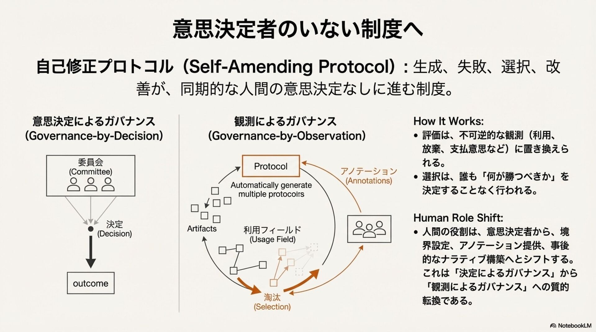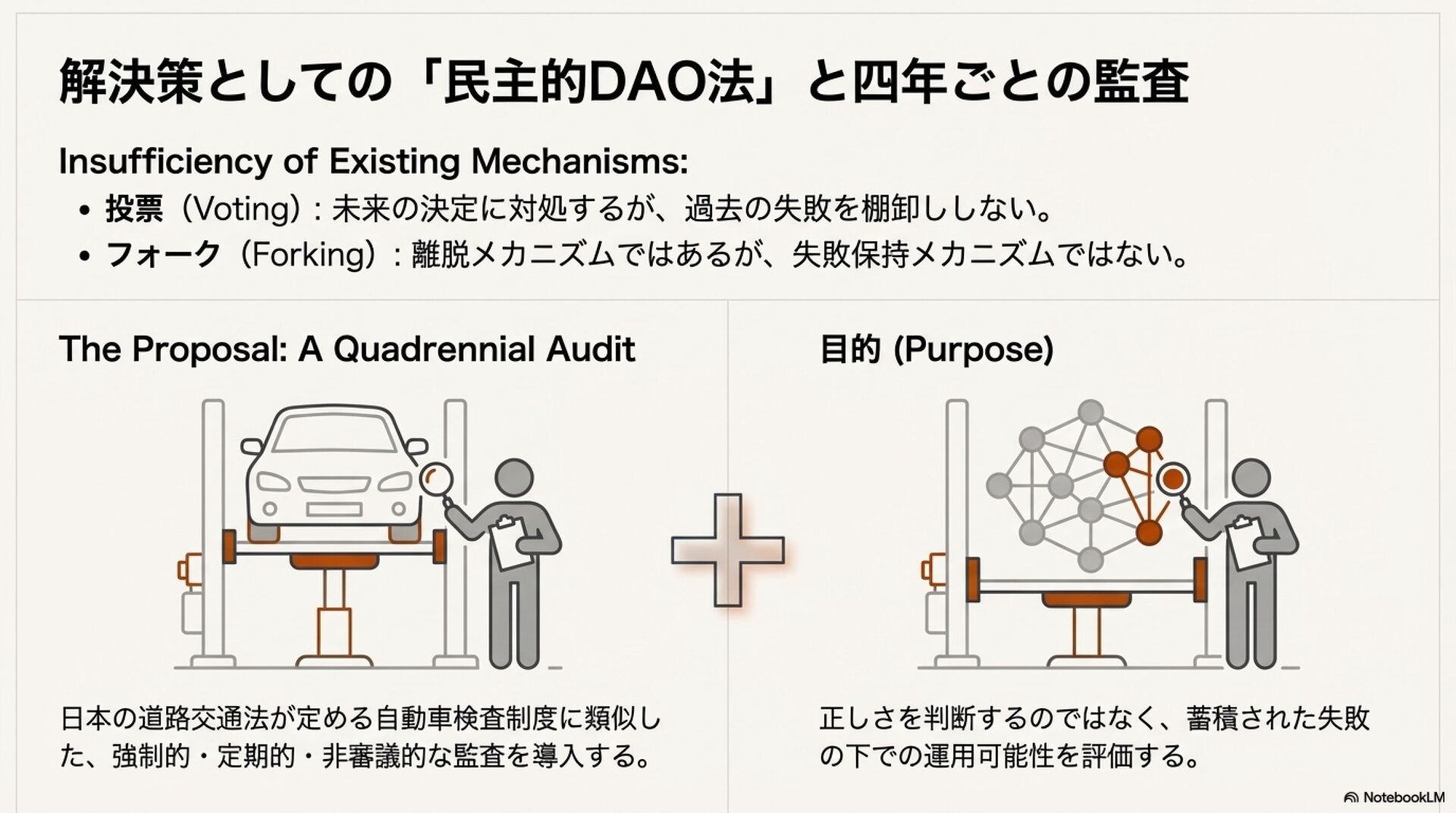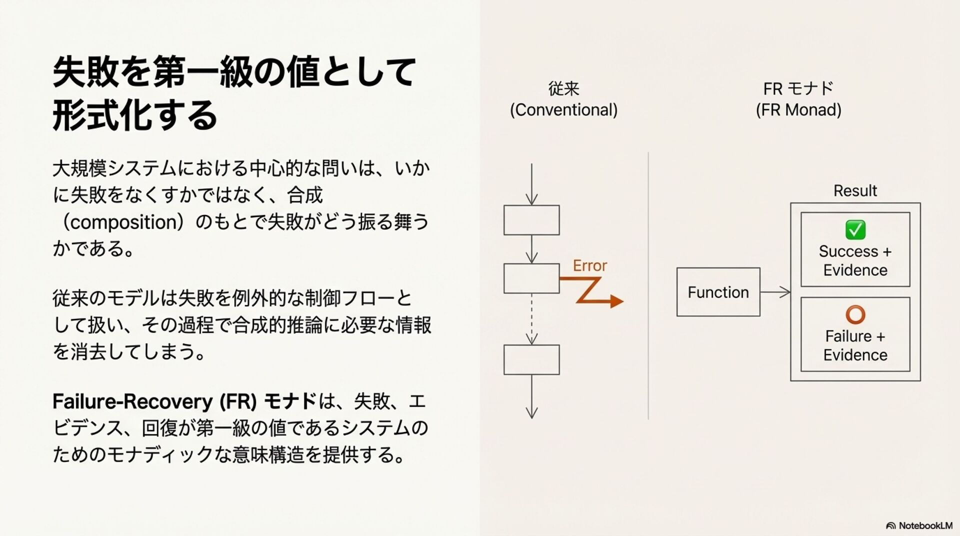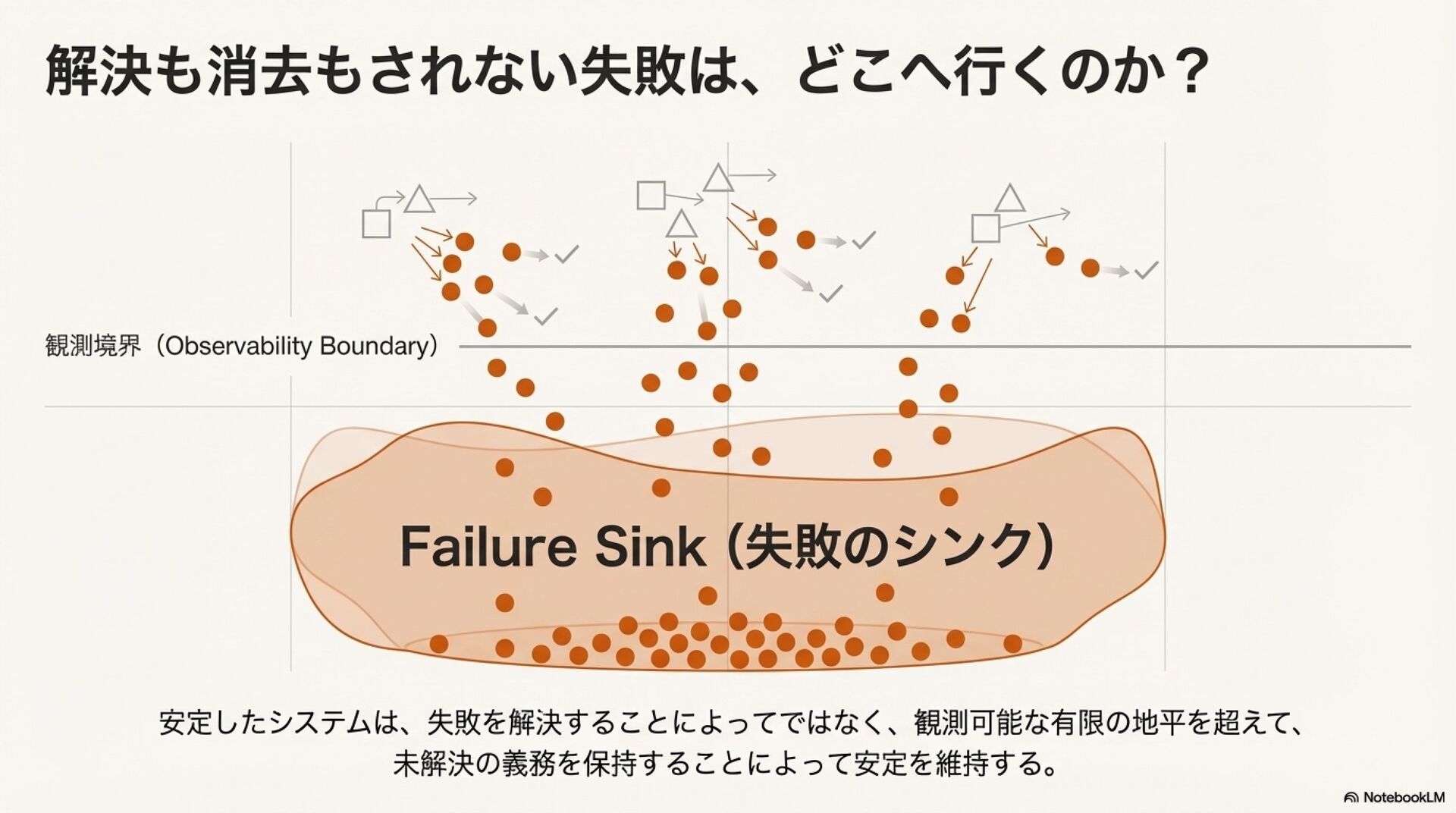 公理的集合論に基づいた構成的な手法でFailure-Recovery Monadsを定義した。これはSystem of Systemsの壊れやすさを緩和するための工学的技法であると同時に、人文的な複雑系を数理論理的に記述する有用な道具立てである。このFRMonadの上にFailure Sink概念を定義し、Failure Sinkを公理として大衆を含む論理における失敗可能性と失敗の損失のしわ寄せ先に関する定式化を行った。この分析フレームワークを用いることで、独裁制・間接民主制・直接民主制・P2Pプロトコルなどの多様な複雑系の挙動を数理論理的に記述することが可能となった。本スライドはFailure Sinkのレンズを通して見た社会における正義論のあり方について議論し、数理論理を用いることなく一般向けに説明を試みるものである。