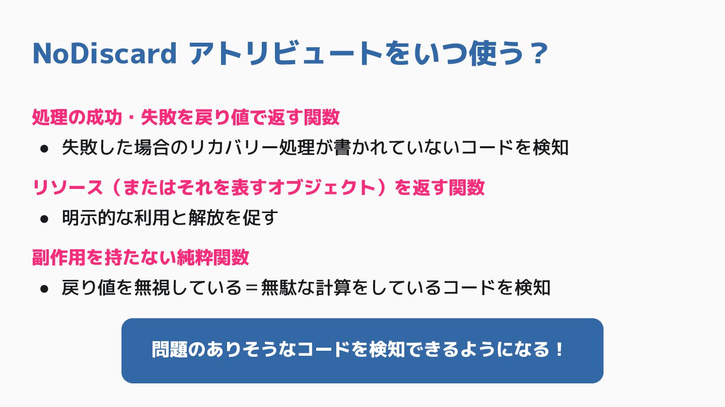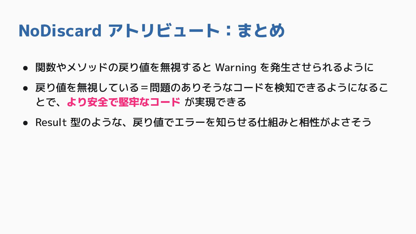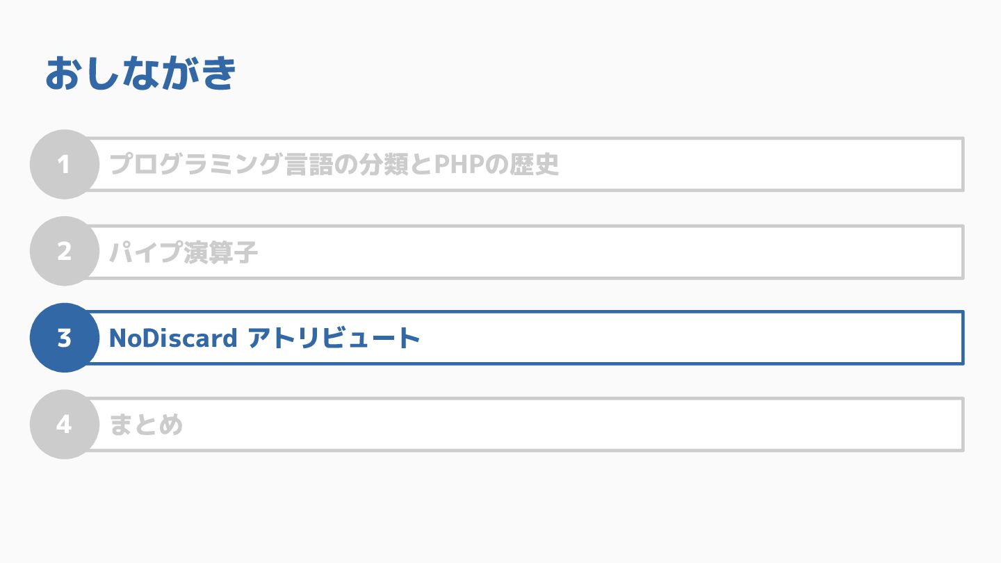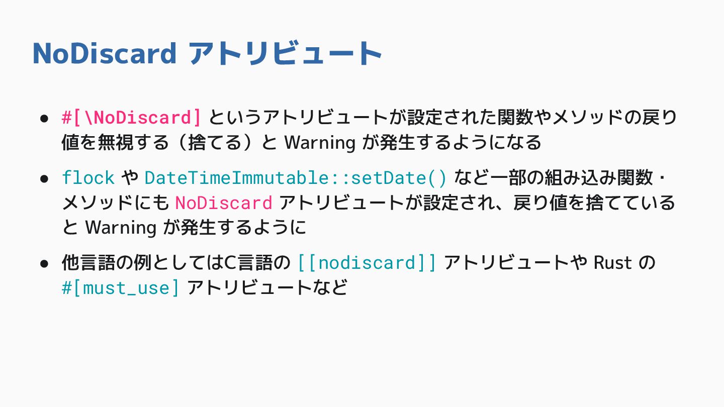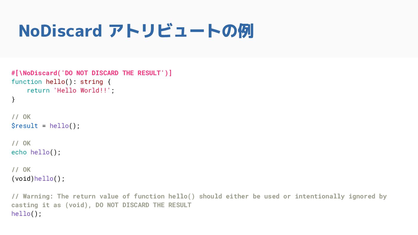 'Hello World!!'; } // OK $result = hello(); // OK echo hello(); // OK (void)hello(); // Warning: The return value of function hello() should either be used or intentionally ignored by casting it as (void), DO NOT DISCARD THE RESULT hello(); NoDiscard アトリビュートの例