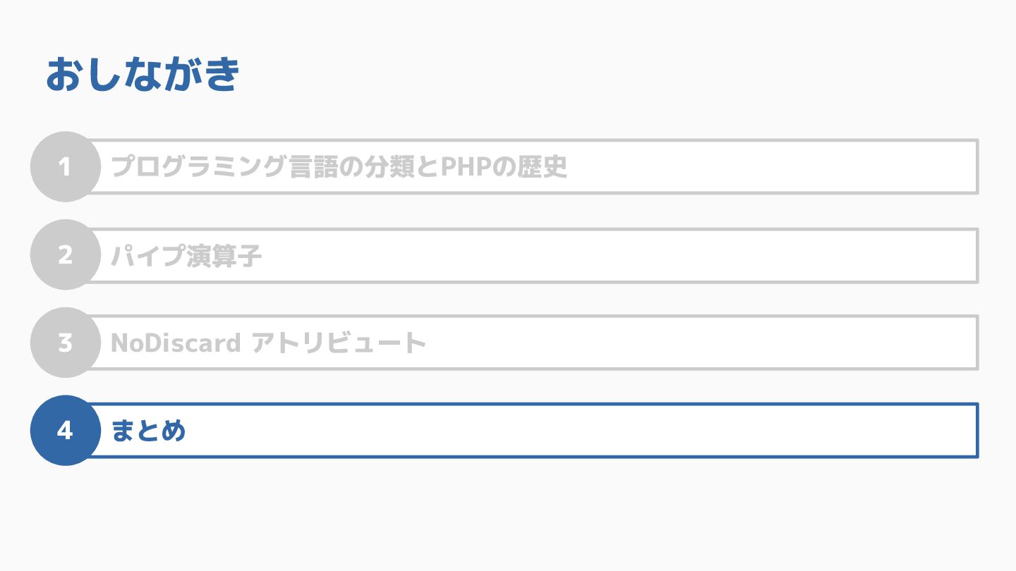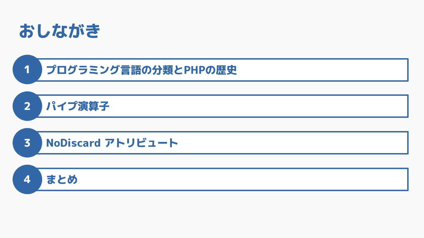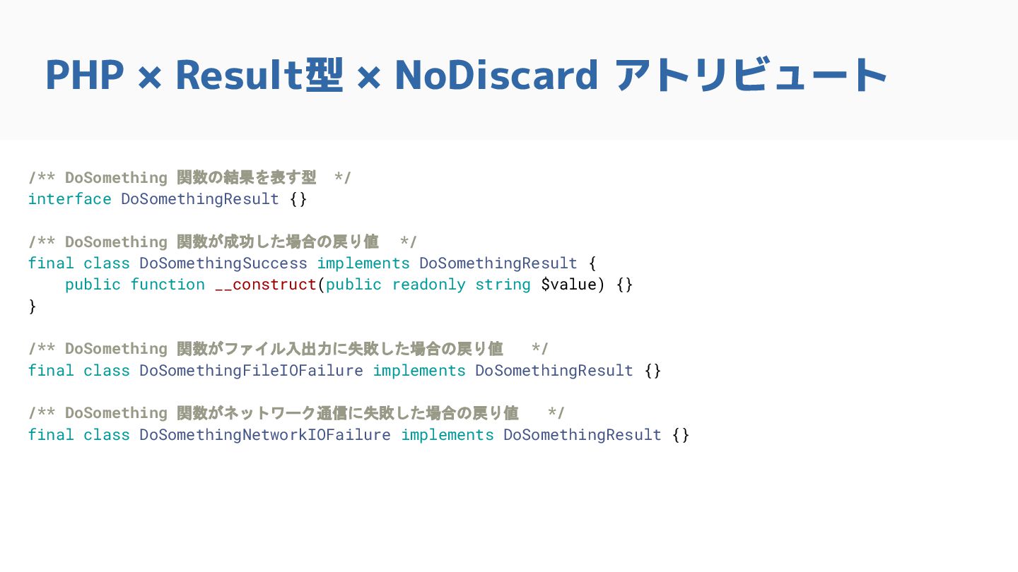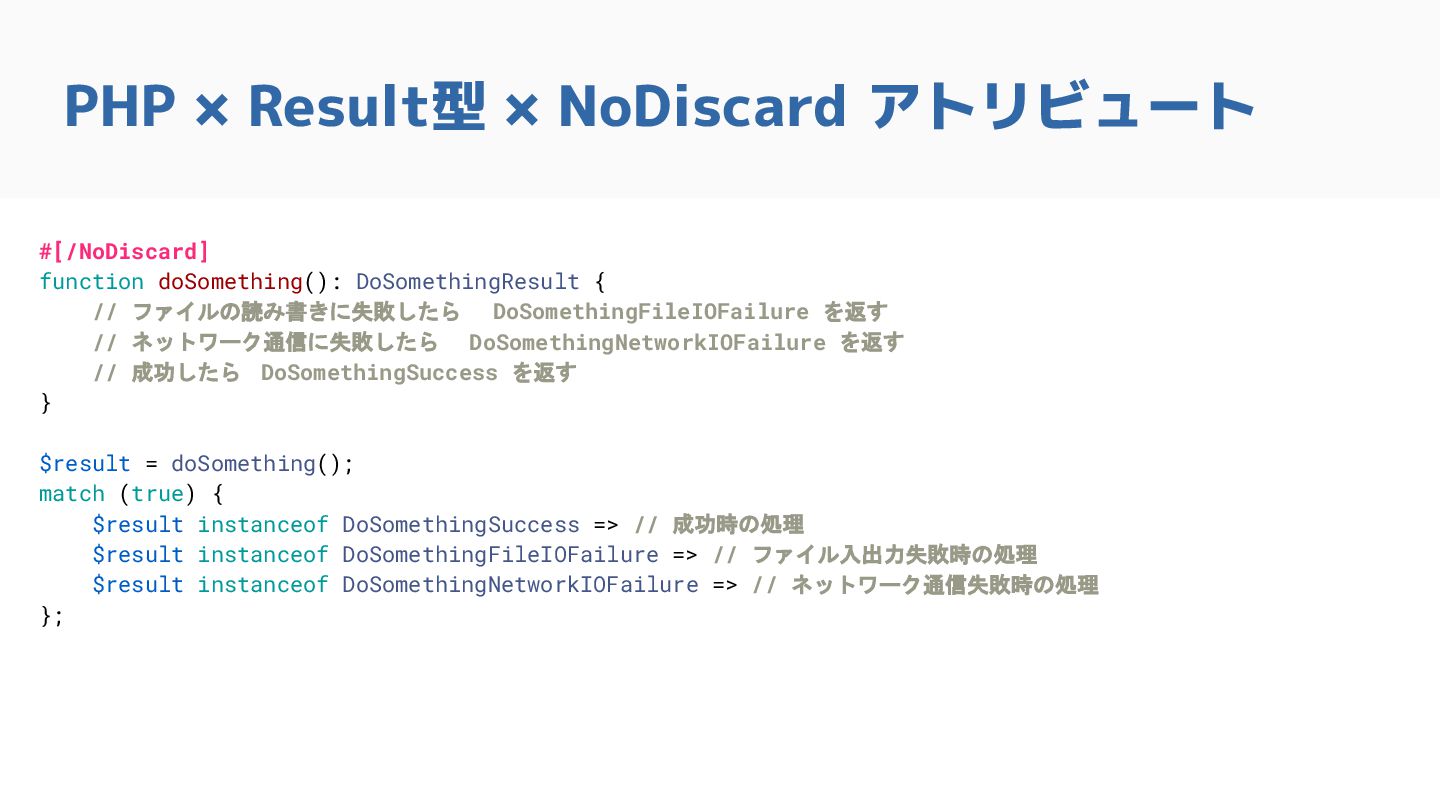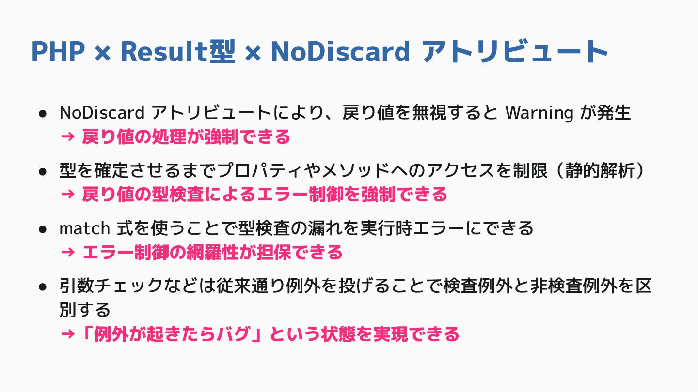 'Hello World!!'; } // OK $result = hello(); // OK echo hello(); // OK (void)hello(); // Warning: The return value of function hello() should either be used or intentionally ignored by casting it as (void), DO NOT DISCARD THE RESULT hello(); NoDiscard アトリビュートの例