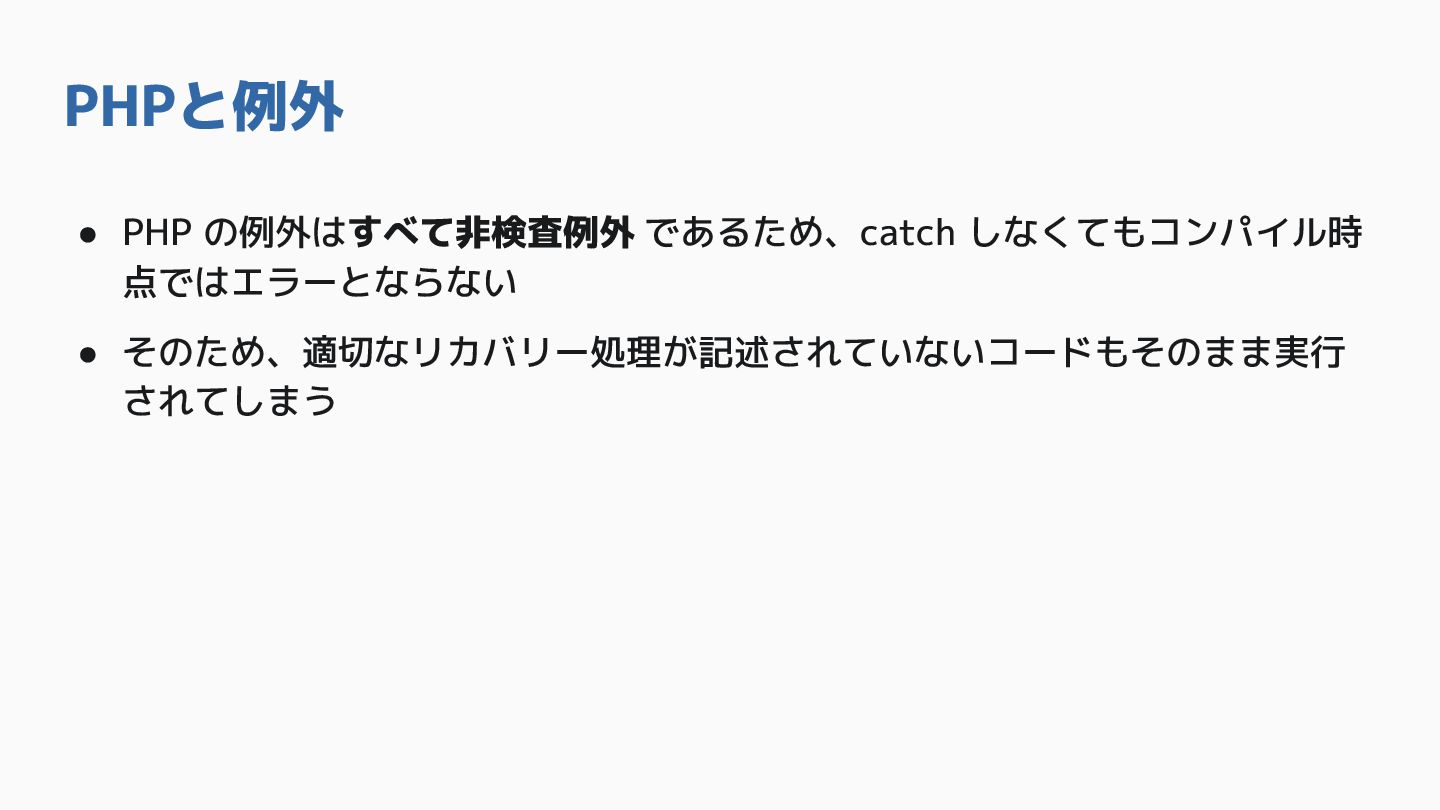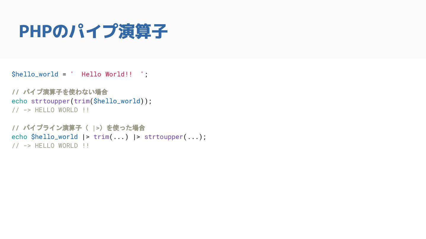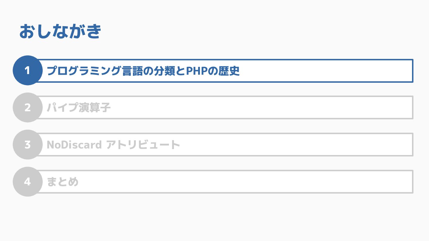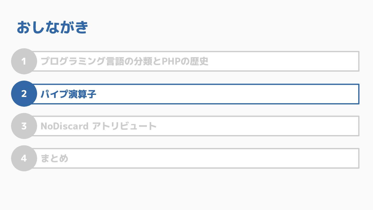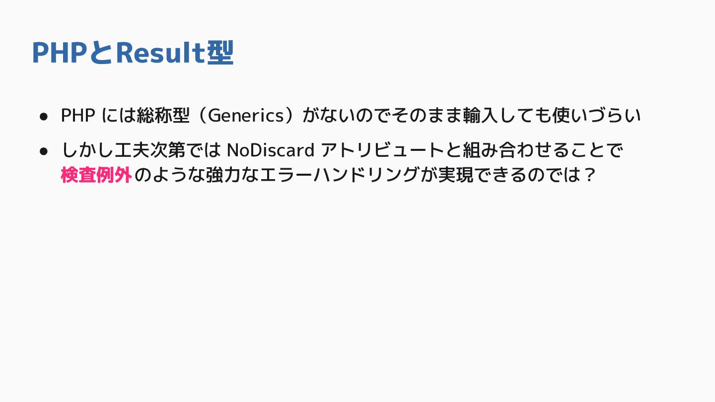 'Hello World!!'; } // OK $result = hello(); // OK echo hello(); // OK (void)hello(); // Warning: The return value of function hello() should either be used or intentionally ignored by casting it as (void), DO NOT DISCARD THE RESULT hello(); NoDiscard アトリビュートの例