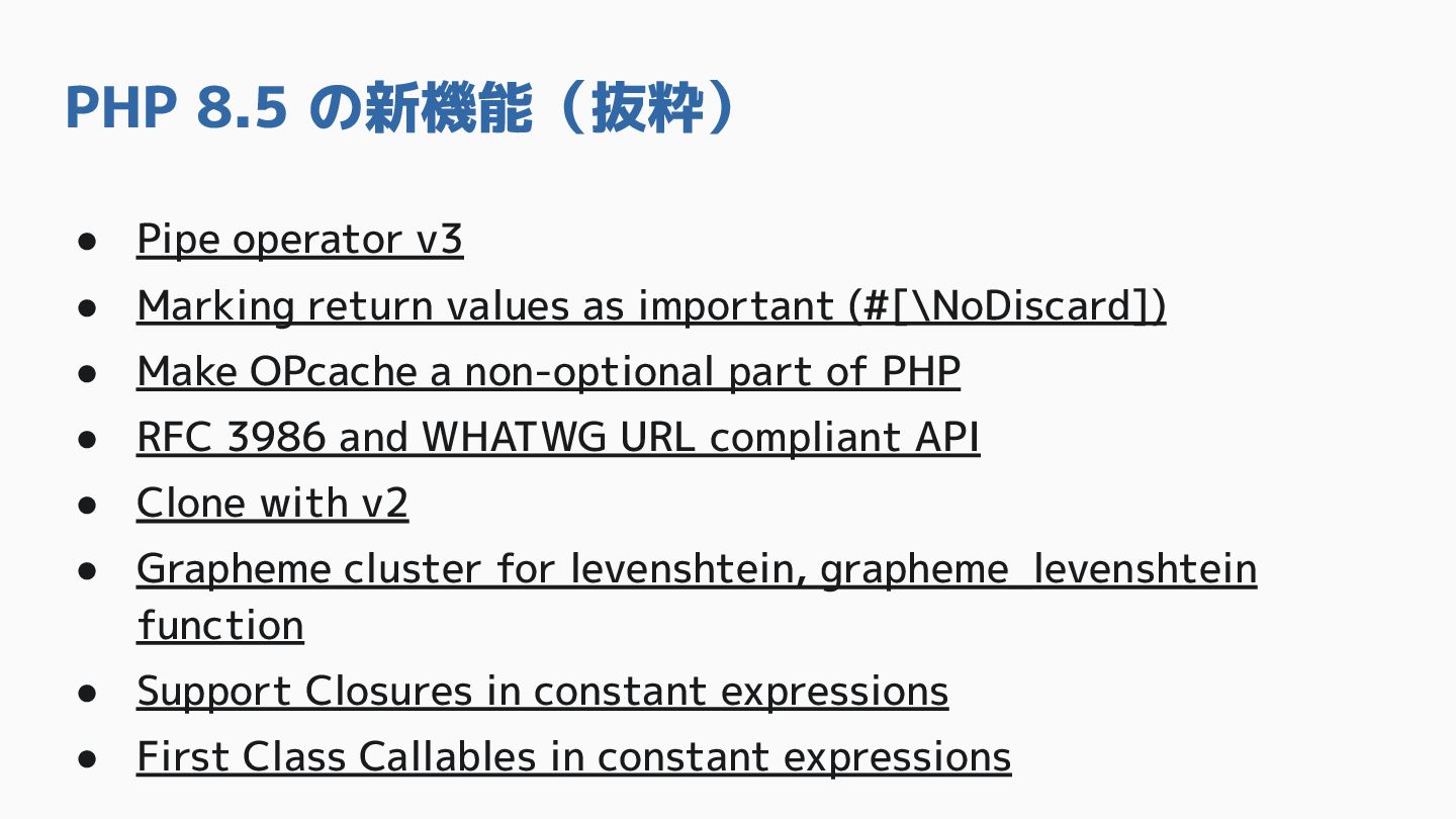 values as important (#[\NoDiscard]) • Make OPcache a non-optional part of PHP • RFC 3986 and WHATWG URL compliant API • Clone with v2 • Grapheme cluster for levenshtein, grapheme_levenshtein function • Support Closures in constant expressions • First Class Callables in constant expressions
