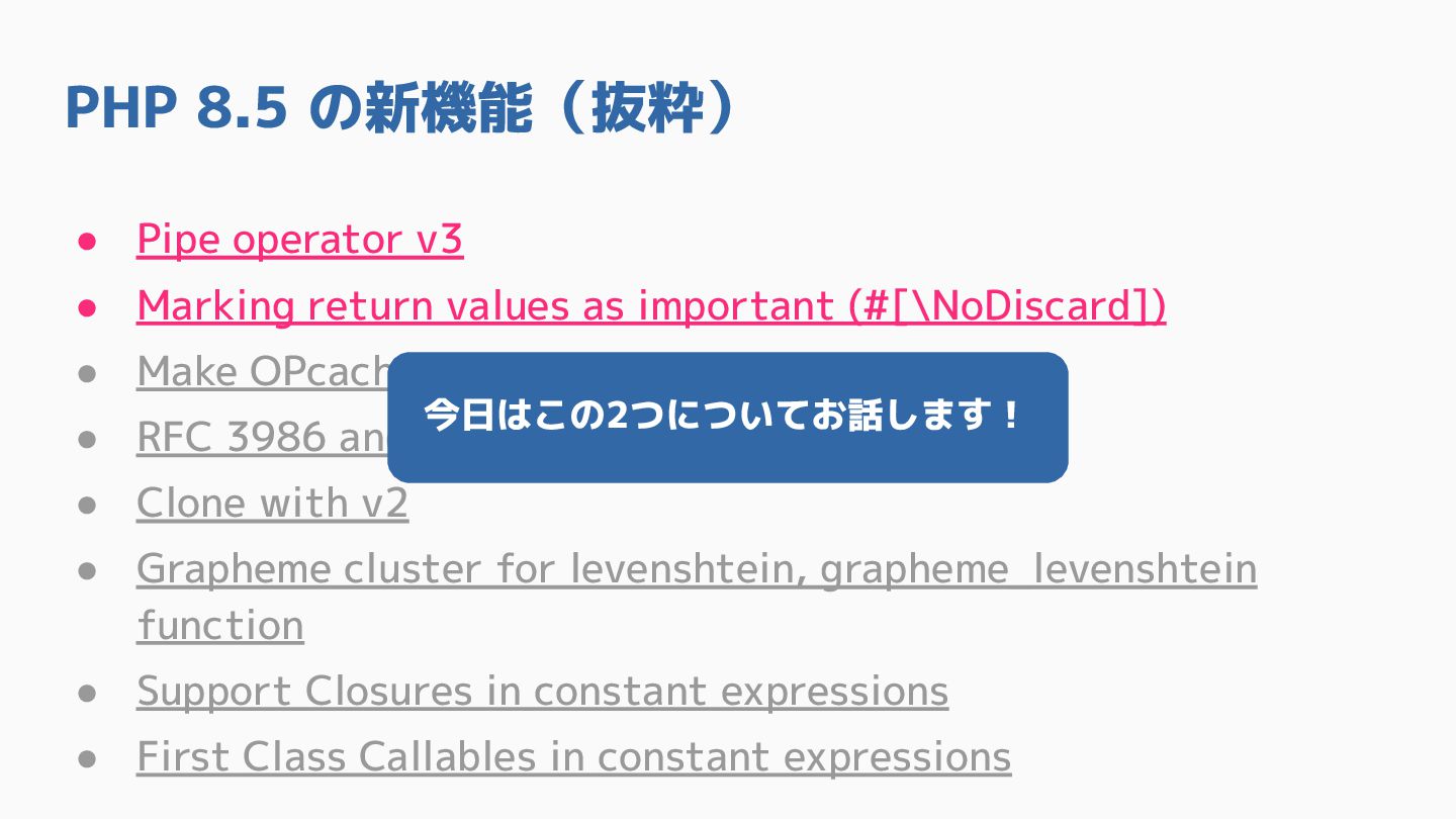 values as important (#[\NoDiscard]) • Make OPcache a non-optional part of PHP • RFC 3986 and WHATWG URL compliant API • Clone with v2 • Grapheme cluster for levenshtein, grapheme_levenshtein function • Support Closures in constant expressions • First Class Callables in constant expressions 今日はこの2つについてお話します!