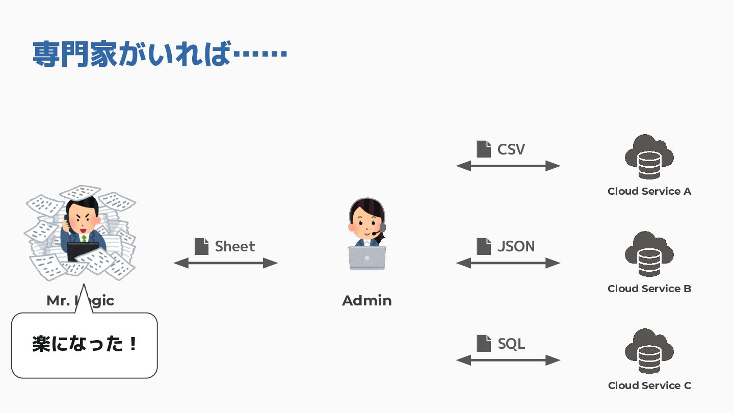 Cloud Service A Cloud Service C CSV JSON SQL 面倒だな…