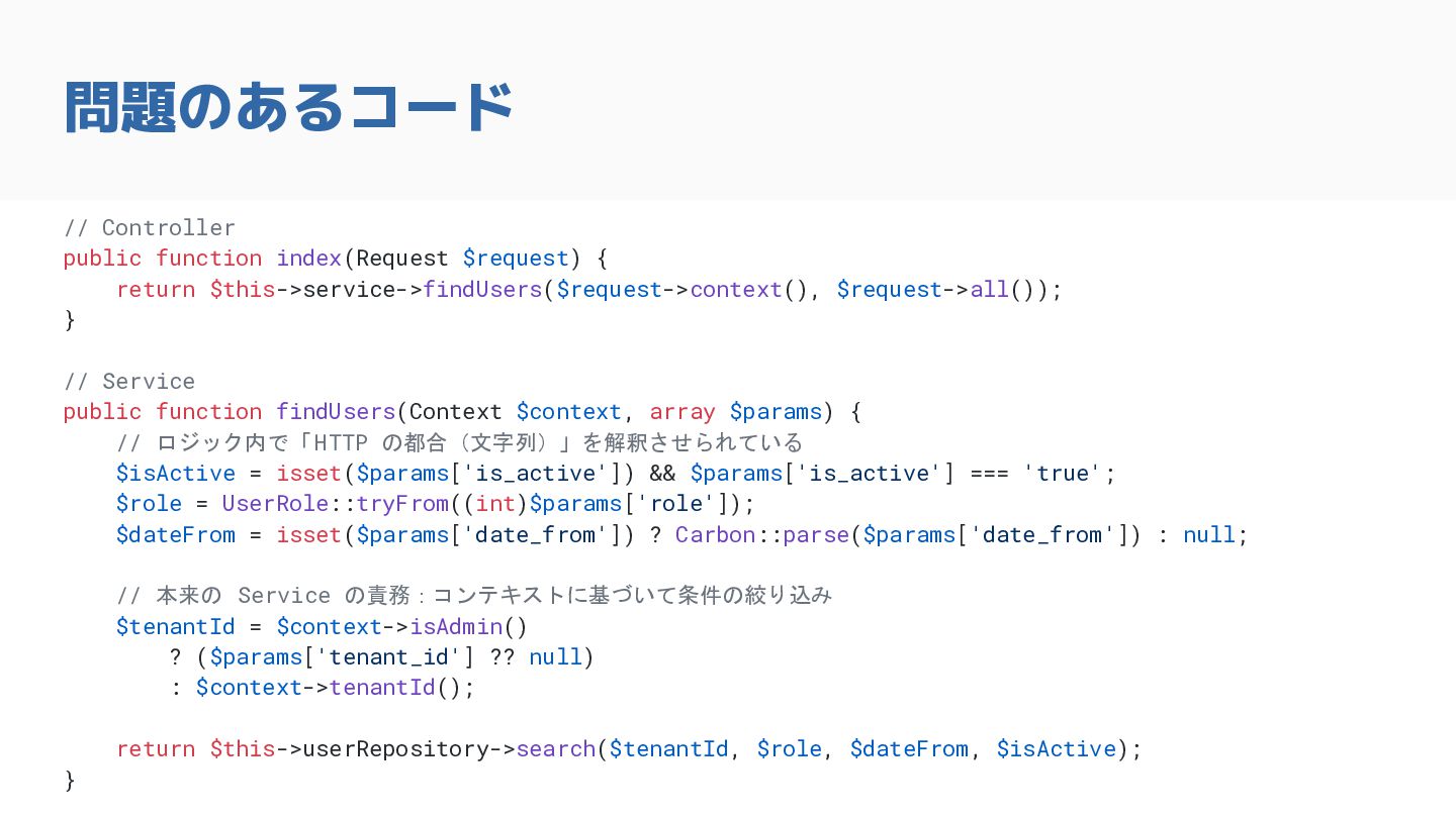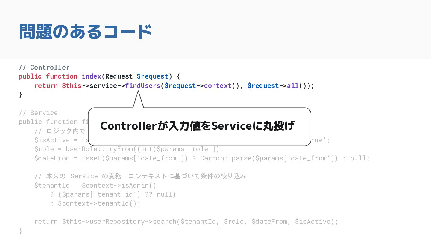 $request->all()); } // Service public function findUsers(Context $context, array $params) { // ロジック内で「 HTTP の都合(文字列)」を解釈させられている $isActive = isset($params['is_active']) && $params['is_active'] === 'true'; $role = UserRole::tryFrom((int)$params['role']); $dateFrom = isset($params['date_from']) ? Carbon::parse($params['date_from']) : null; // 本来の Service の責務:コンテキストに基づいて条件の絞り込み $tenantId = $context->isAdmin() ? ($params['tenant_id'] ?? null) : $context->tenantId(); return $this->userRepository->search($tenantId, $role, $dateFrom, $isActive); } Controllerが入力値をServiceに丸投げ