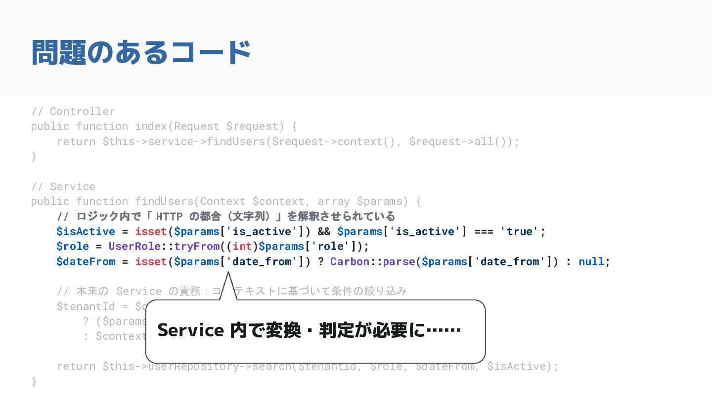 $request->all()); } // Service public function findUsers(Context $context, array $params) { // ロジック内で「 HTTP の都合(文字列)」を解釈させられている $isActive = isset($params['is_active']) && $params['is_active'] === 'true'; $role = UserRole::tryFrom((int)$params['role']); $dateFrom = isset($params['date_from']) ? Carbon::parse($params['date_from']) : null; // 本来の Service の責務:コンテキストに基づいて条件の絞り込み $tenantId = $context->isAdmin() ? ($params['tenant_id'] ?? null) : $context->tenantId(); return $this->userRepository->search($tenantId, $role, $dateFrom, $isActive); } Service 内で変換・判定が必要に……
