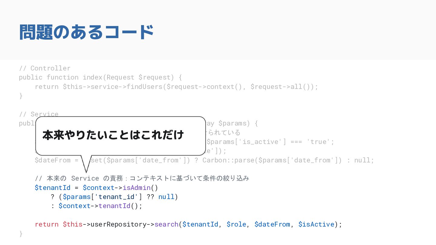 $request->all()); } // Service public function findUsers(Context $context, array $params) { // ロジック内で「 HTTP の都合(文字列)」を解釈させられている $isActive = isset($params['is_active']) && $params['is_active'] === 'true'; $role = UserRole::tryFrom((int)$params['role']); $dateFrom = isset($params['date_from']) ? Carbon::parse($params['date_from']) : null; // 本来の Service の責務:コンテキストに基づいて条件の絞り込み $tenantId = $context->isAdmin() ? ($params['tenant_id'] ?? null) : $context->tenantId(); return $this->userRepository->search($tenantId, $role, $dateFrom, $isActive); } 本来やりたいことはこれだけ