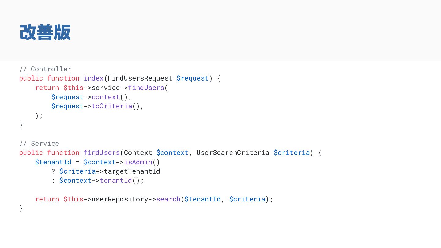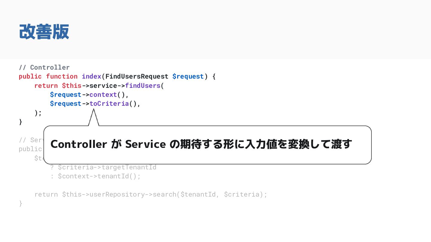 $request->context(), $request->toCriteria(), ); } // Service public function findUsers(Context $context, UserSearchCriteria $criteria) { $tenantId = $context->isAdmin() ? $criteria->targetTenantId : $context->tenantId(); return $this->userRepository->search($tenantId, $criteria); } Controller が Service の期待する形に入力値を変換して渡す