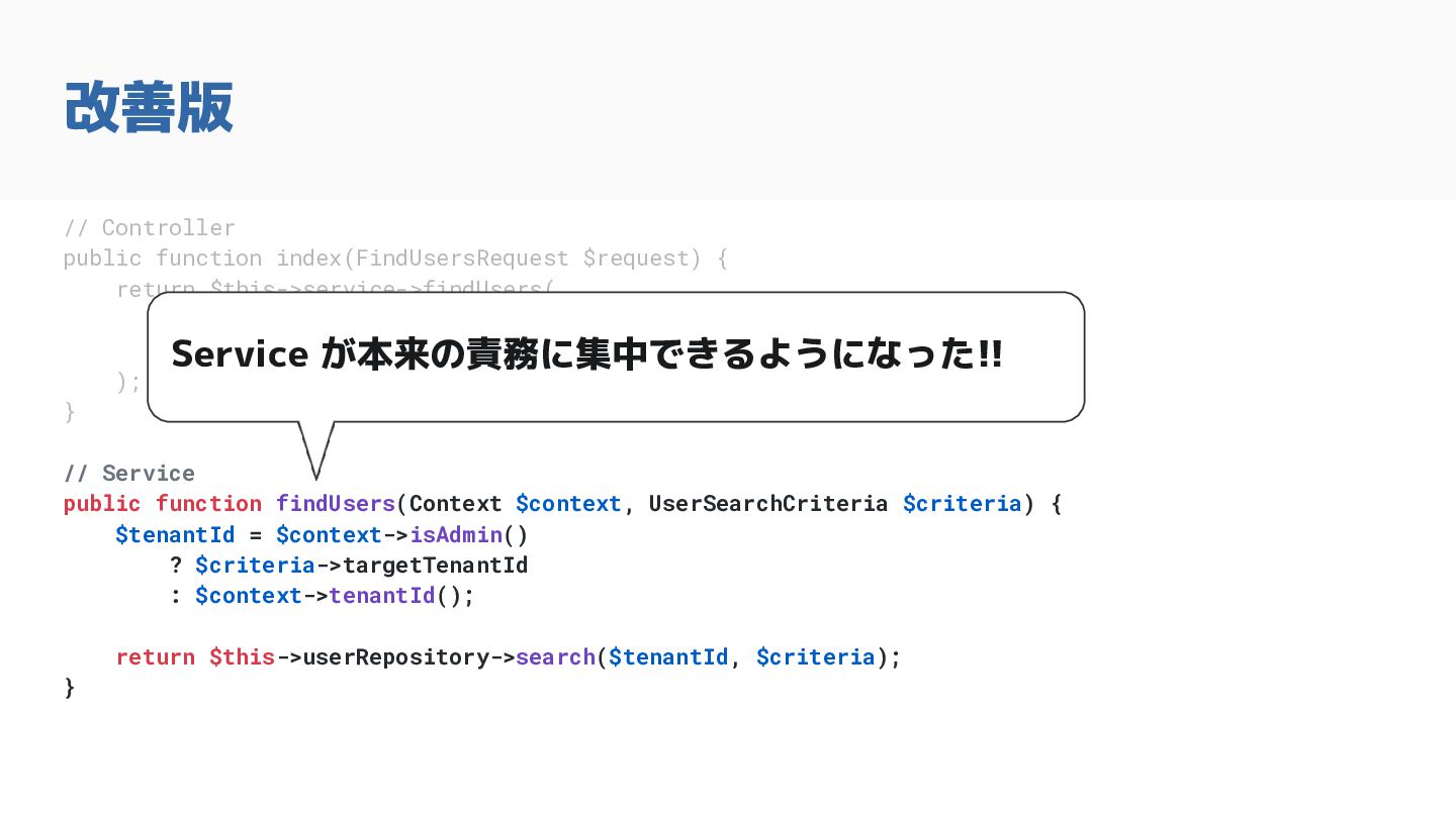 $request->context(), $request->toCriteria(), ); } // Service public function findUsers(Context $context, UserSearchCriteria $criteria) { $tenantId = $context->isAdmin() ? $criteria->targetTenantId : $context->tenantId(); return $this->userRepository->search($tenantId, $criteria); } Service が本来の責務に集中できるようになった!!