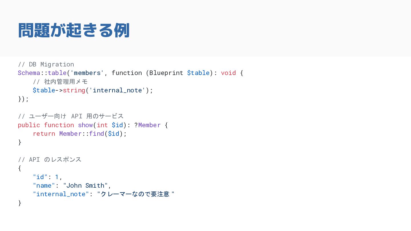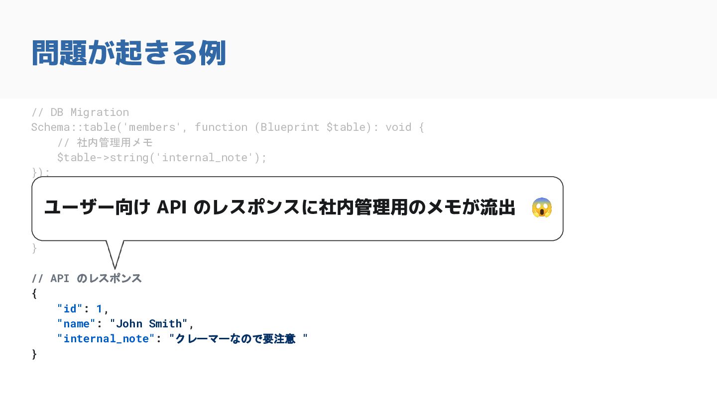 // 社内管理用メモ $table->string('internal_note'); }); // ユーザー向け API 用のサービス public function show(int $id): ?Member { return Member::find($id); } // API のレスポンス { "id": 1, "name": "John Smith", "internal_note": "クレーマーなので要注意 " } ユーザー向け API のレスポンスに社内管理用のメモが流出 😱