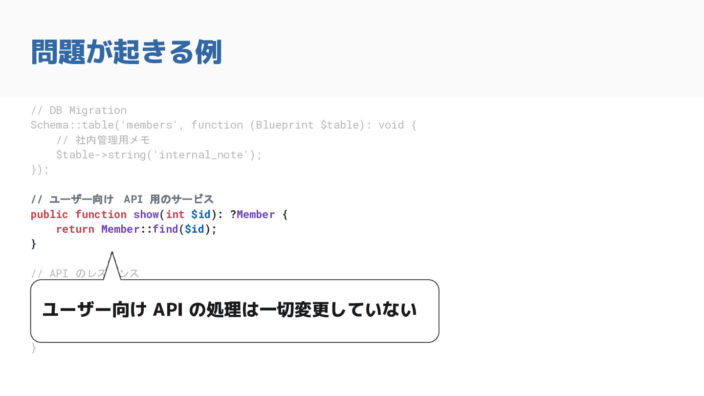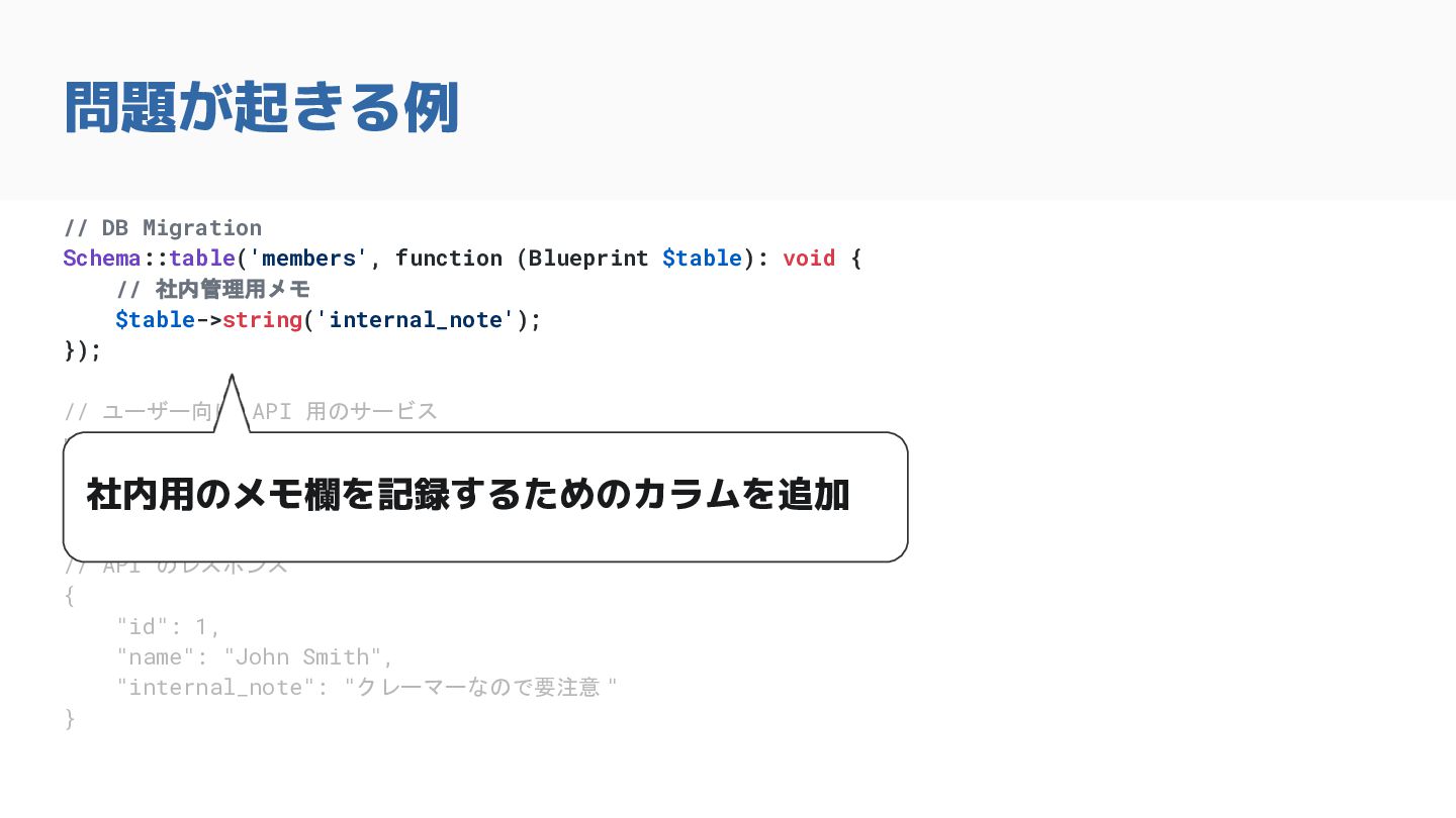 // 社内管理用メモ $table->string('internal_note'); }); // ユーザー向け API 用のサービス public function show(int $id): ?Member { return Member::find($id); } // API のレスポンス { "id": 1, "name": "John Smith", "internal_note": "クレーマーなので要注意 " } ユーザー向け API の処理は一切変更していない