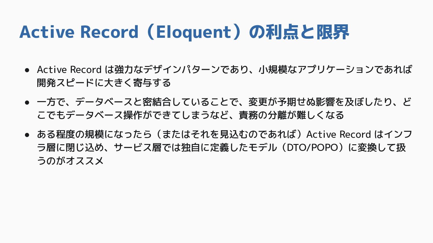 EloquentMember::find($id)?->toDomainModel(); } // Service public function lookup(int $id): ?Member { try { $member = $this->repository->lookup($id); } catch (QueryException $e) { $this->logger->error('Database query failed', ['exception' => $e]); } return $member; } データーベースに関する技術的詳細が層を超えて登場