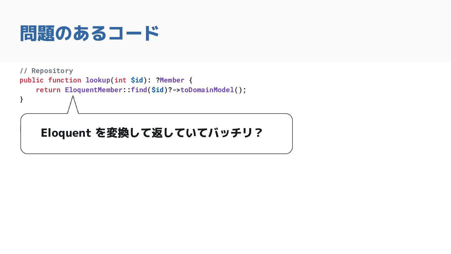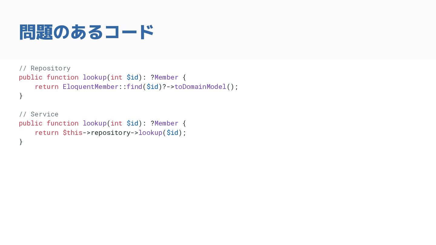 21. 問題のあるコード // Repository public function lookup(int $id): ?Member { return