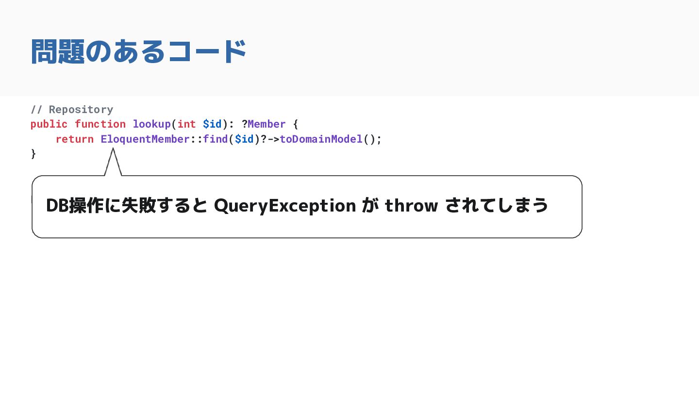 EloquentMember::find($id)?->toDomainModel(); } // Service public function lookup(int $id): ?Member { return $this->repository->lookup($id); } DB操作に失敗すると QueryException が throw されてしまう