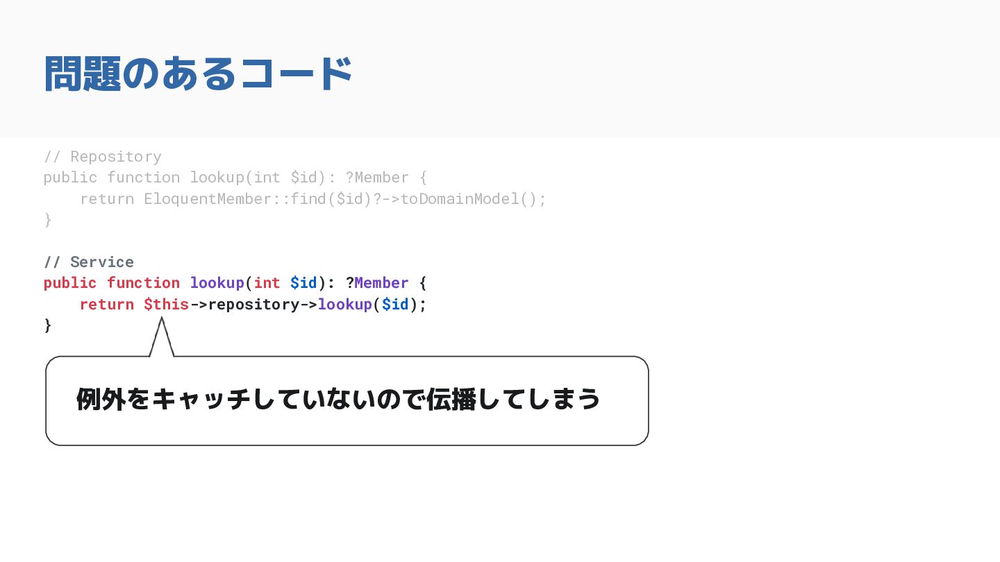 EloquentMember::find($id)?->toDomainModel(); } // Service public function lookup(int $id): ?Member { return $this->repository->lookup($id); } 例外をキャッチしていないので伝播してしまう