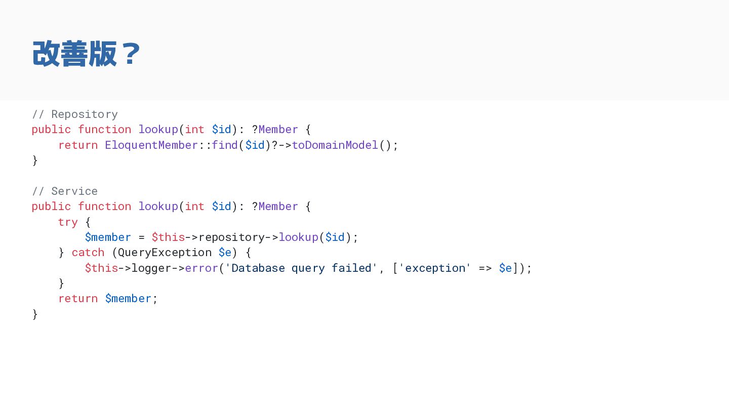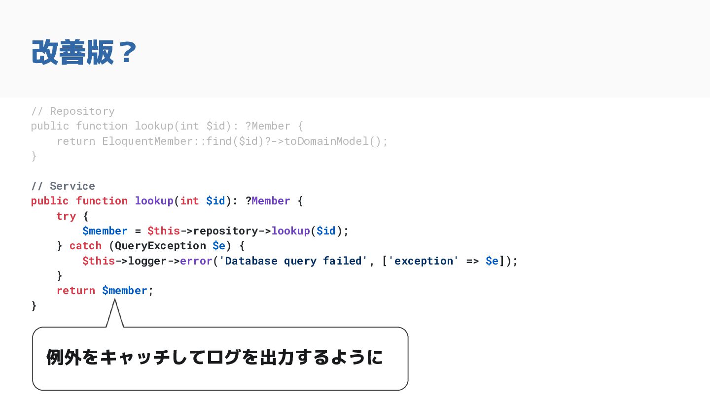 EloquentMember::find($id)?->toDomainModel(); } // Service public function lookup(int $id): ?Member { try { $member = $this->repository->lookup($id); } catch (QueryException $e) { $this->logger->error('Database query failed', ['exception' => $e]); } return $member; } 例外をキャッチしてログを出力するように