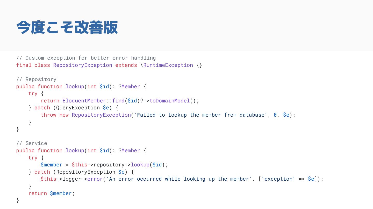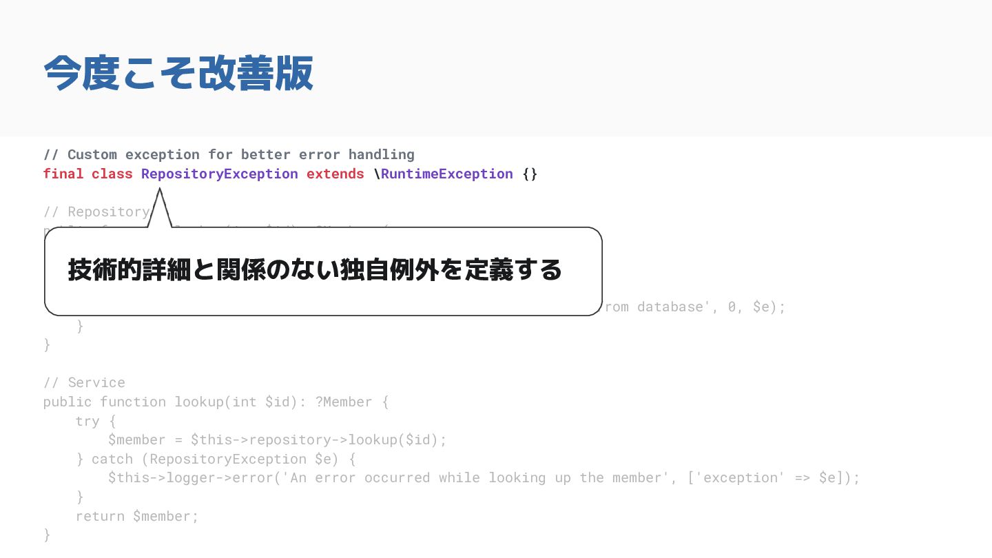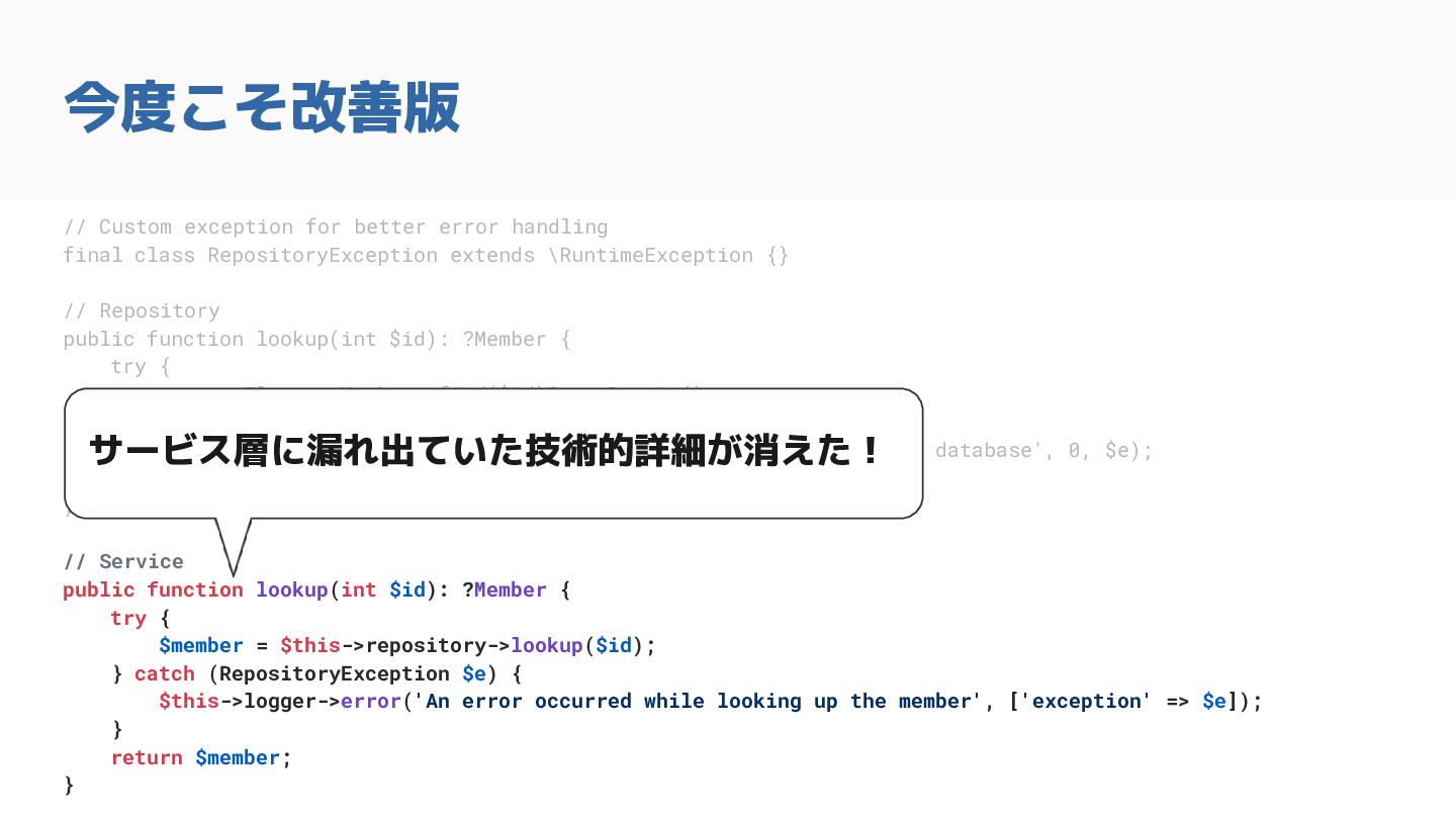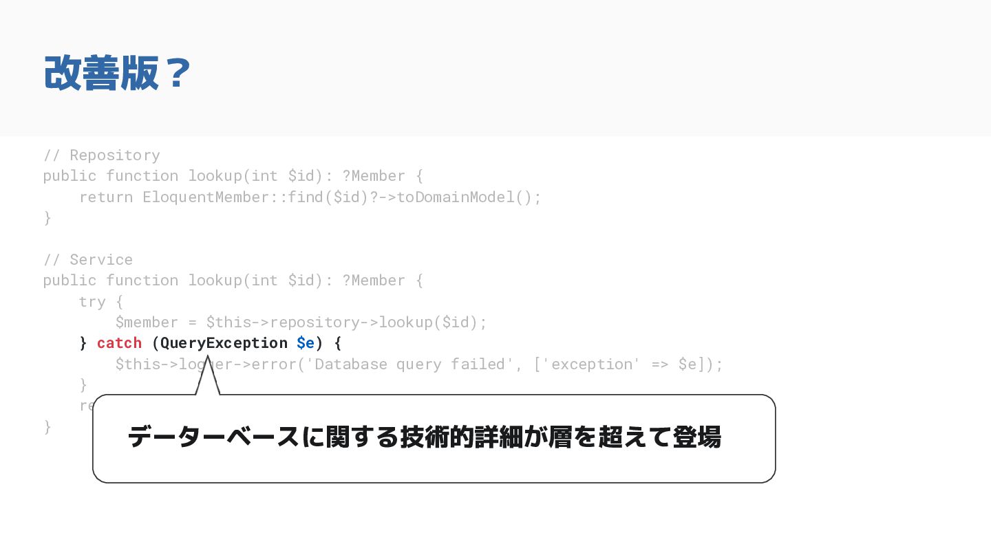 RepositoryException extends \RuntimeException {} // Repository public function lookup(int $id): ?Member { try { return EloquentMember::find($id)?->toDomain(); } catch (QueryException $e) { throw new RepositoryException('Failed to lookup the member from database', 0, $e); } } // Service public function lookup(int $id): ?Member { try { $member = $this->repository->lookup($id); } catch (RepositoryException $e) { $this->logger->error('An error occurred while looking up the member', ['exception' => $e]); } return $member; } サービス層に漏れ出ていた技術的詳細が消えた!