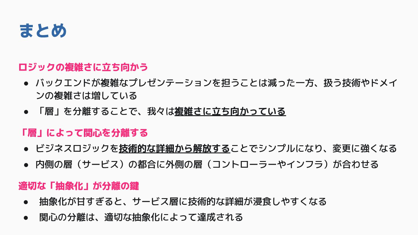 • 内側の層(サービス)の都合に外側の層(コントローラーやインフラ)が合わせる 適切な「抽象化」が分離の鍵 • 抽象化が甘すぎると、サービス層に技術的な詳細が浸食しやすくなる • 関心の分離は、適切な抽象化によって達成される