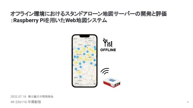 オフライン環境におけるスタンドアローン地図サーバーの開発と評価 :Raspberry Piを用いたWeb地図システム 49-226116 平澤彰悟 1 2022.07.18 修士論文中間発表会